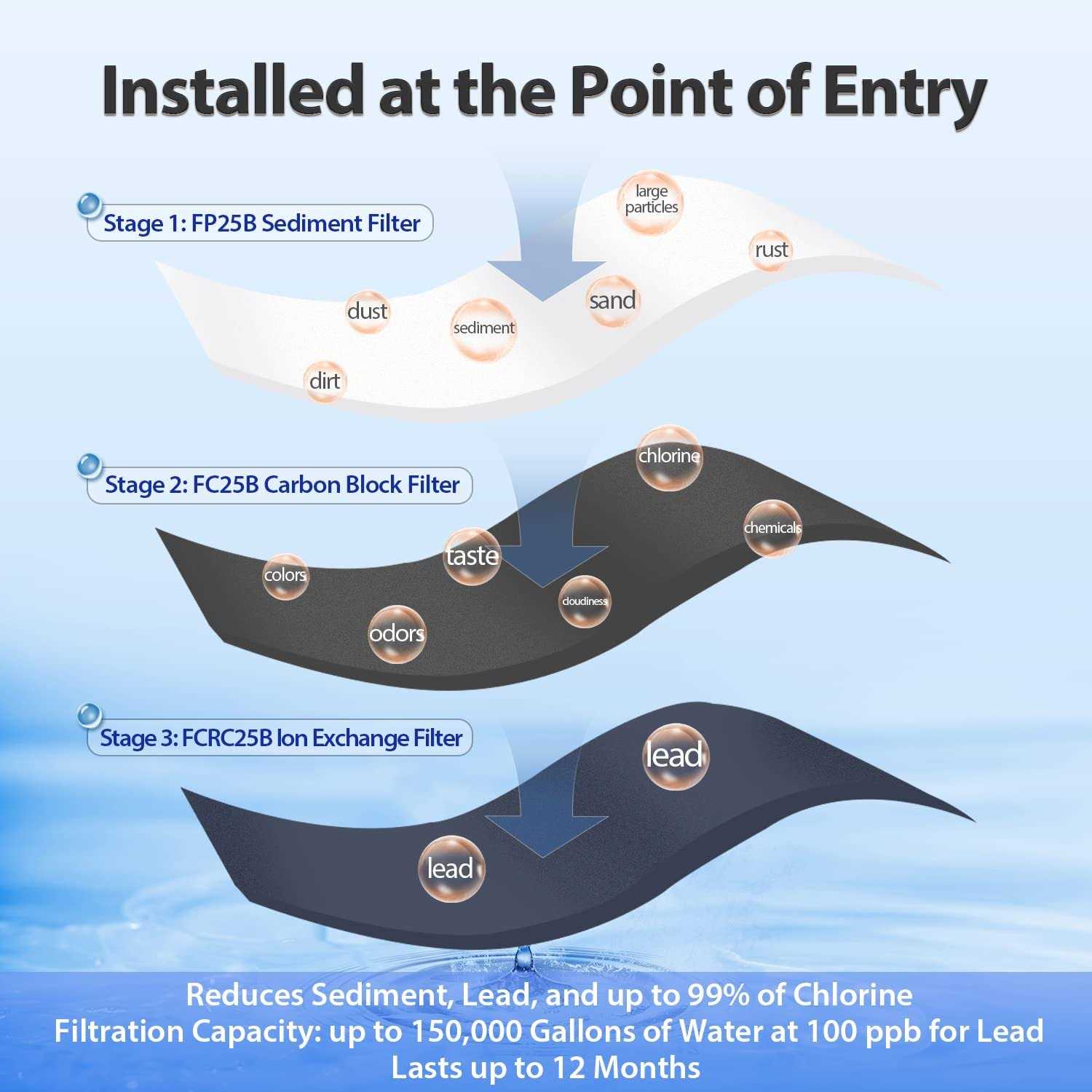 The WGB32B-PB whole house water filter system is an ideal “point of entry” filtration system for cleaning up well or city water. Unlike “point of use” systems that are installed to supply water to a specific faucet, the WGB32B-PB whole house water filtration system filters your water from the source. This means water from every output in your home will have passed through the three filtration stages of the WGB32B-PB whole house water filter. The stage 1 housing holds a 5-micron high-capacity polypropylene sediment filter. This filter removes dirt and other various larger sized particles from the water that can clog the following filters. The second stage houses a 5-micron CTO coconut shell carbon block filter. Block carbon is more effective than other forms of carbon in that it is more effective in removing their targeted contaminants. The carbon block filter knocks out bad tastes and odors, removes up to 99% of chlorine from the water, and is highly effective on industrial chemicals. The third stage houses a lead reducing water filter (FCRC25B). Color: Lead Removal w/ Hoses.