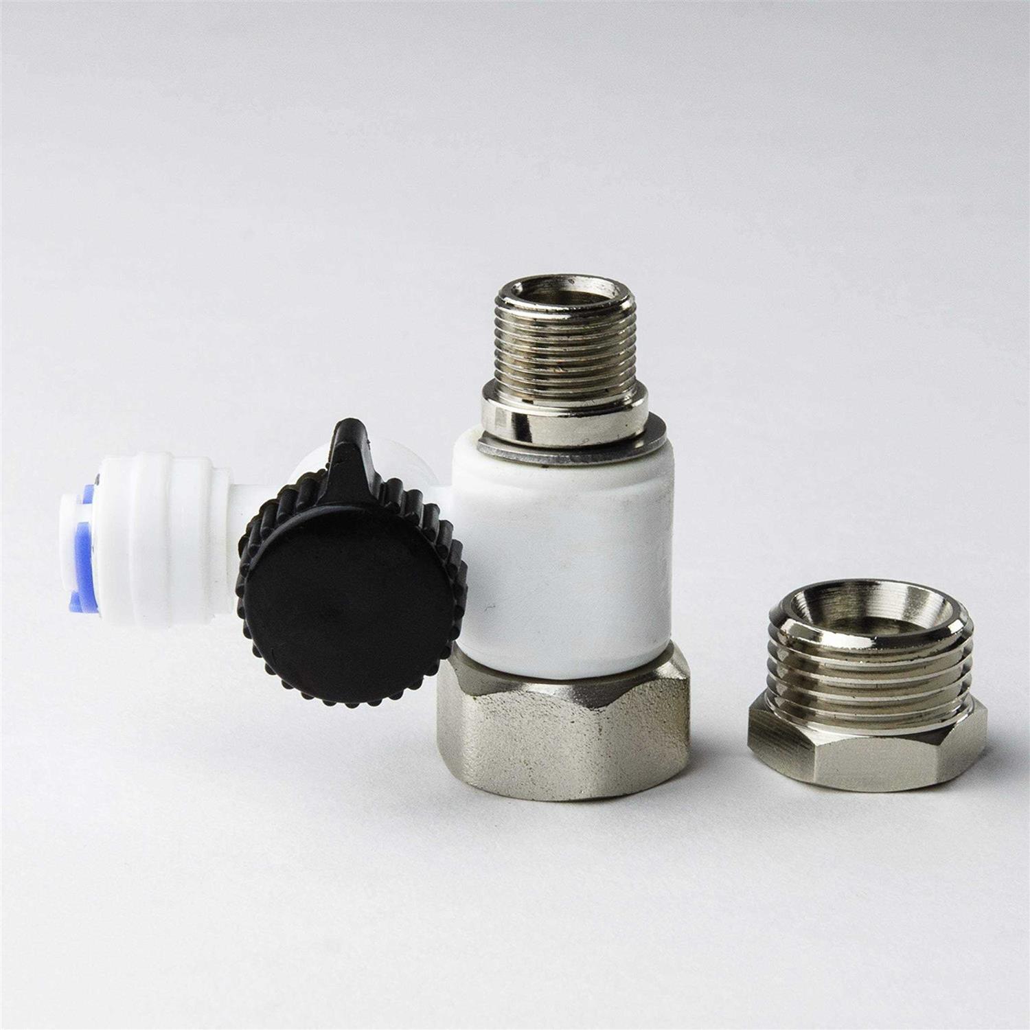 Ceramic valve disk for up to 1 million leak-free smooth turns Washer included No tools required for installation The iSpring feed water Adapter connects between the cold water Supply multi-turn angle valve and flexible riser pipe, to the main water Supply, for applications in reverse osmosis filtration systems, automatic coffee brewers, ice makers and many more. The included Conversion Adapter (busing) can be threaded onto either side of the valve to make the configuration of 3/8 inch x 3/8 inch comp or 1/2 inch x 1/2 inch NPT. Please read these instructions carefully before installing this product and refer to the water filter installation guide.