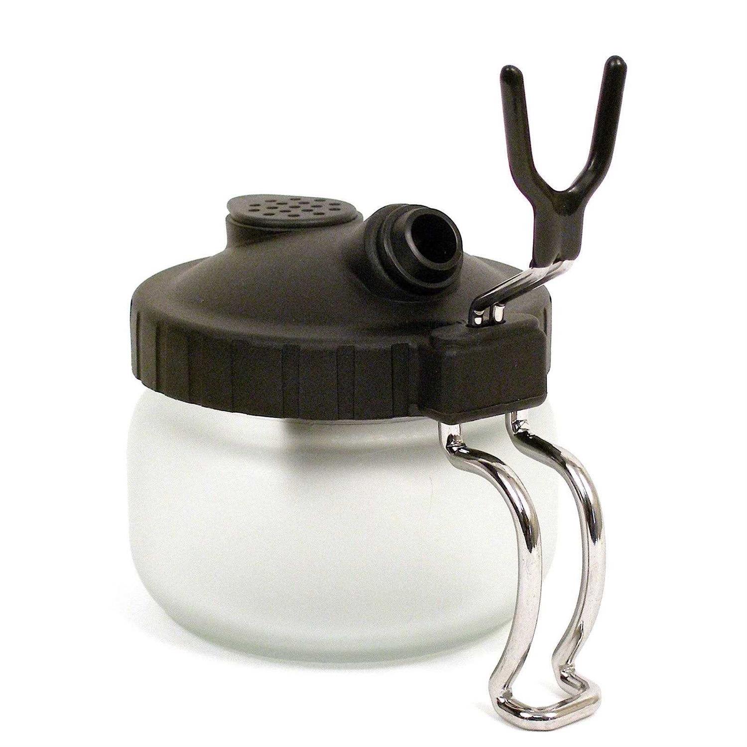 Airbrush clean-up is a breeze with the Iwata Spray Out Pot. The Pot comes with airbrush hanger,easy-to-change filter,and 10 oz. dishwasher safe glass pot container. Provides a convenient and portable solution for your cleaning needs.Airbrushes attach easily to the container,and best of all,because of the innovative design,theres no overspray while cleaning your airbrush. Replacement filter is also available.