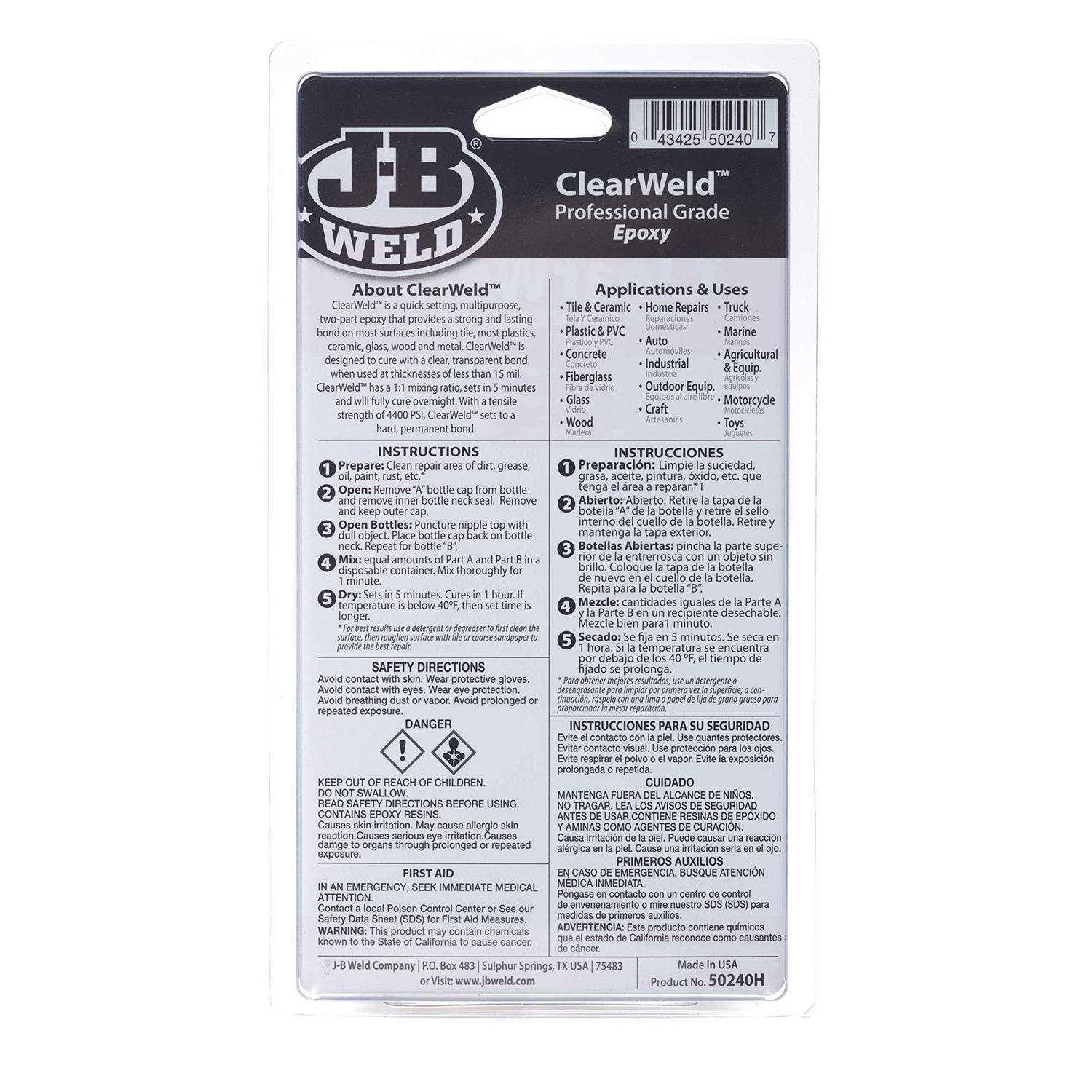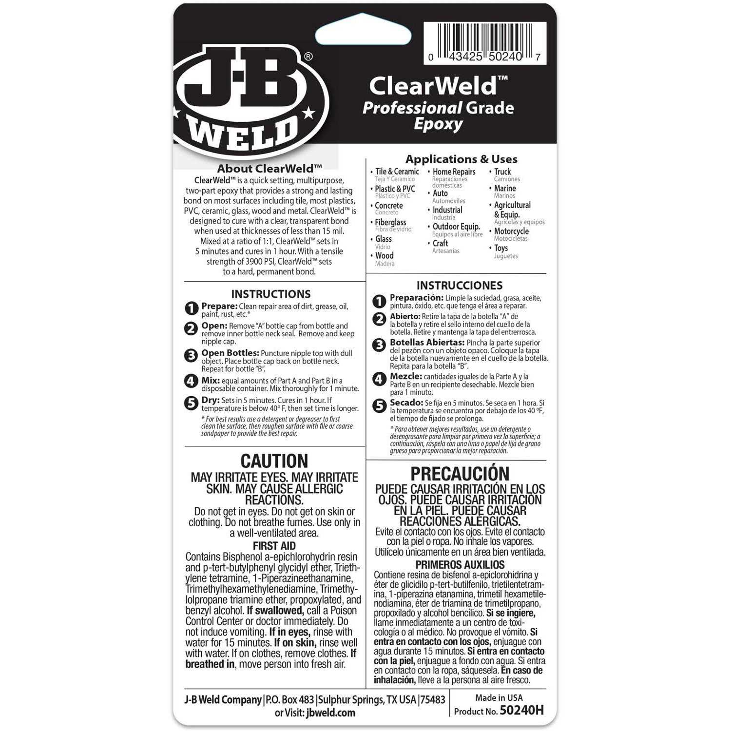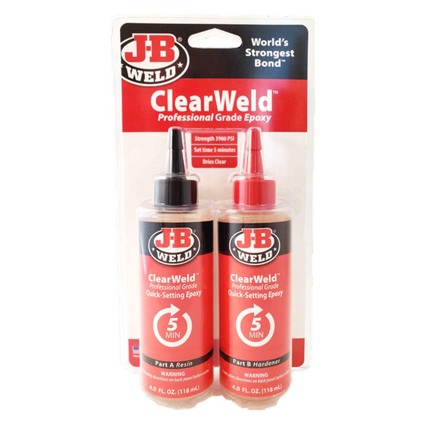 JB Weld ClearWeld Syringe is a quick setting multipurpose two part epoxy that provides a strong and lasting bond on most surfaces including tile most plastics ceramic glass wood and metal. ClearWeld is designed to cure with a clear transparent bond when used at thicknesses of less than 15 mil. ClearWeld has a 11 mixing ratio sets in 5 minutes and cures in 1 hour. With a tensile strength of 3900 PSI ClearWeld sets to a hard permanent bond.