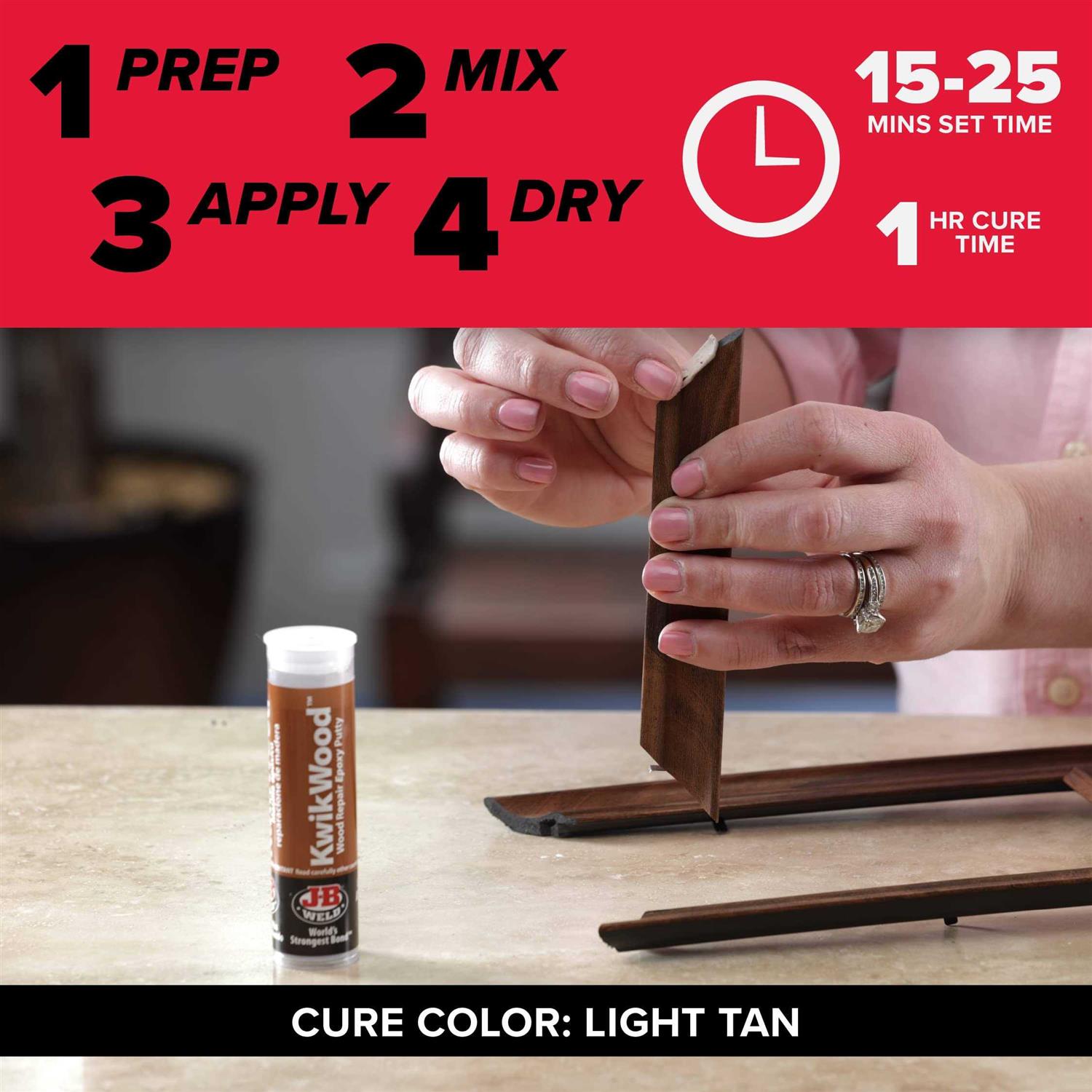 - Sets in 15-25 minutes, cures in 1 hour to a light tan color with the same density as wood