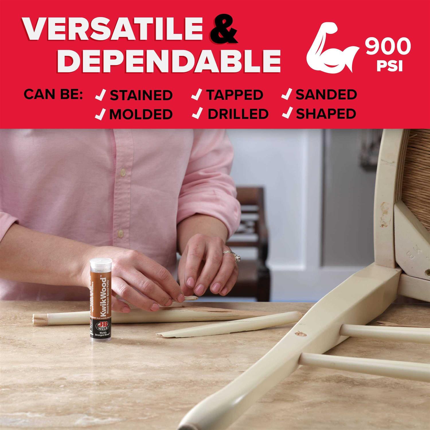 KwikWood by J-B Weld is a hand-mixable epoxy putty, formulated to repair and rebuild wood. After mixing, it cures to the same density as wood and becomes an integral part of the repair. For use on exterior or interior applications, it contains no solvents, will not rot, shrink, crack or pull away. KwikWood has a 15-25 minute work life. After 60 minutes, it can be machined, drilled, tapped, sanded, filed and painted. Stronger than wood, KwikWood dries to a light tan colour.