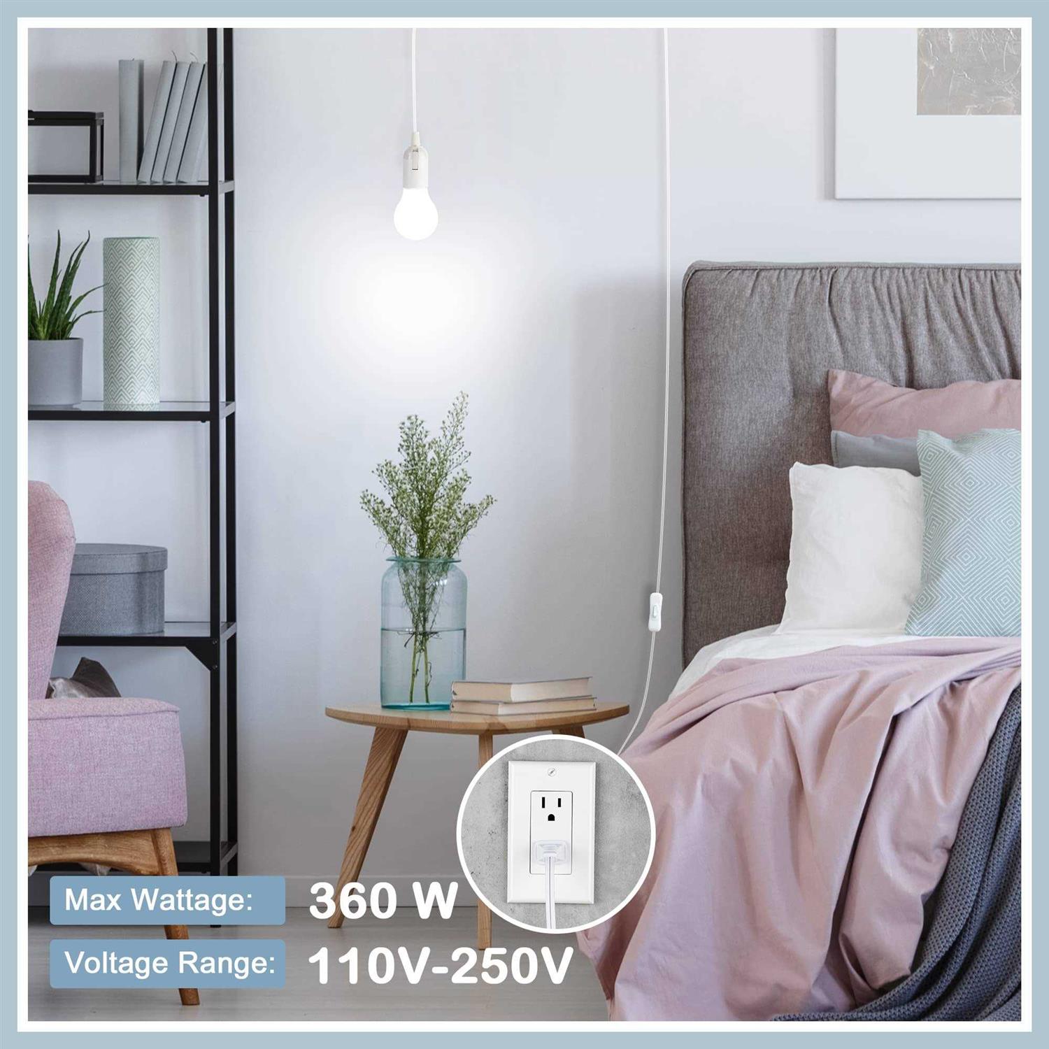 Convenient Switch: Total length 20ft, with an ON/OFF switch to control (4.9ft/1.5m long from the switch to the plug, it is very convenient for you to control the switch). Unlike other brands with the switch in the middle of the cord cable, which is too high to touch. Max power is 360 Wattage, working voltage range: 110V-250V. UL Product: All parts of this product are strictly UL approval.100% safe from fire, the item will both fit with any E26/E27 bulbs. 2-Prong US AC Power Plug. Easy to Use : It’s simple to install the bulb without any tools. Control option which you can turn on and off easily just simply press the button on the cable. Best Light Anywhere: Can be used anywhere you want, perfect for lighting up a bedroom, basement, closet, studio, etc. Ideal for places that you are inconvenient to close to the power source.”