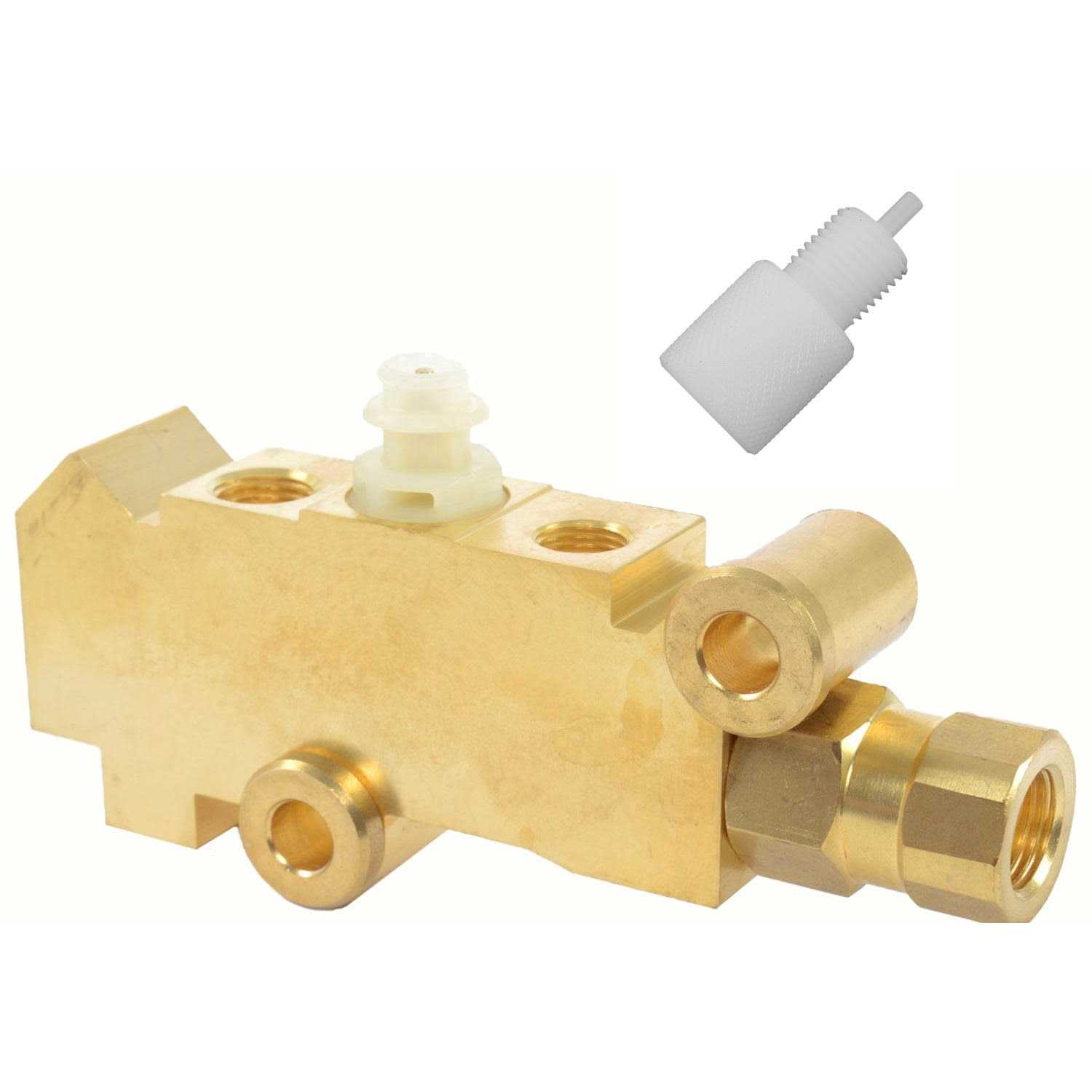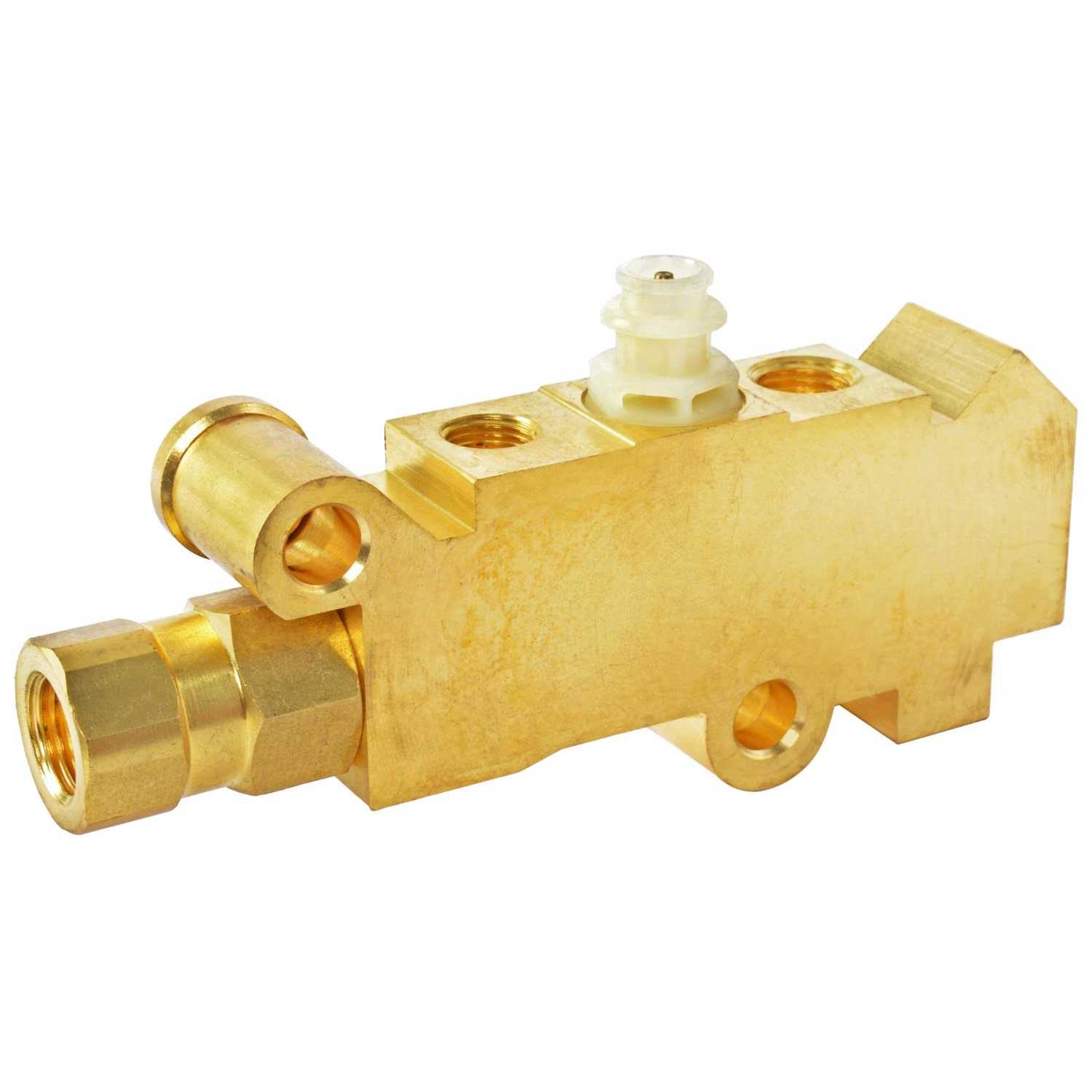Brake Proportioning Valve GM Disc/Drum Applications (2) 3/8 in.-24 Ports for Front Brakes (1) 9/16 in.-18 Port for Rear Brakes One Piece Brass Body JEGS 555-631290 Brake Proportioning Valve Ensures proper brake bias from front to rear to prevent lock up of wheels Designed for front disc / rear drum brakes Specifications: (1) 7/16 in.-24 & (1) 1/2 in.-20 inlet ports, (2) 3/8 in.-24 ports to front brakes & (1) 9/16 in.-18 port to rear brakes Constructed from a one-piece brass body A must-have component to complete your custom brake system Designed to be used on stock configuration brake systems on vehicles with disc/drum brakes. Recommended when large-port GM master cylinder is on the firewall.