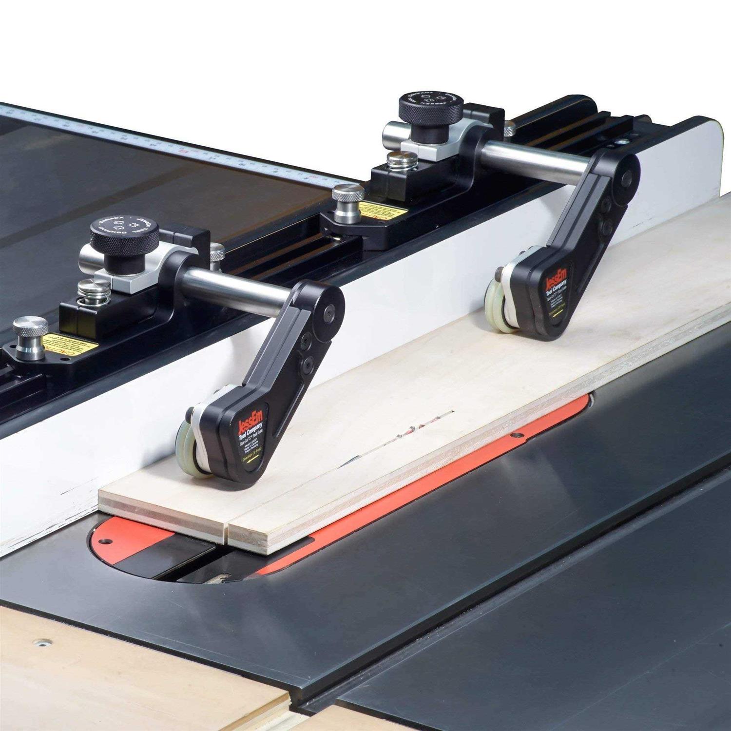 The Jess Em Clear-Cut TS Stock Guides for your table saw offer superior control on your workpiece by securely holding it in position to achieve safer, smoother, and more precise cuts. The unique guide rollers mounted on a 5-degree angle effectively steering your stock towards your fence. This angle causes the roller to hold with more force if the wood tries to move against the direction of the feed. Under spring pressure, the roller arms ensure your work is held firmly in place. Rollers are fitted with one way roller bearings to ensure each roller spins in the direction of the feed to prevent kickback. Fast and Easy Set Up The guides lock into position along the track with a twist of the anodized aluminum clamping knobs. Grip force urethane rollers hold your stock securely in position. When not in use they tuck away in behind the surface of your fence. Perfect for Boards or Large Panels The guides have 3-1/8 of total vertical travel and can accommodate a maximum stock thickness of 13/16 above the mounting surface when mounted to the T-track. The Clear-Cut TS Guides give you complete control of your stock even when routing wide boards or large panels. The dual action of the guides will pull your work tight to the fence. Material and Construction The guides are CNC-machined from 6000 series aluminum and anodized for appearance and durability. The roller axels are machined from cold rolled steel and case hardened for durability, while rollers are designed from wear-resistant acetal resin. Traction tires are molded out of urethane for long life and superior grip.