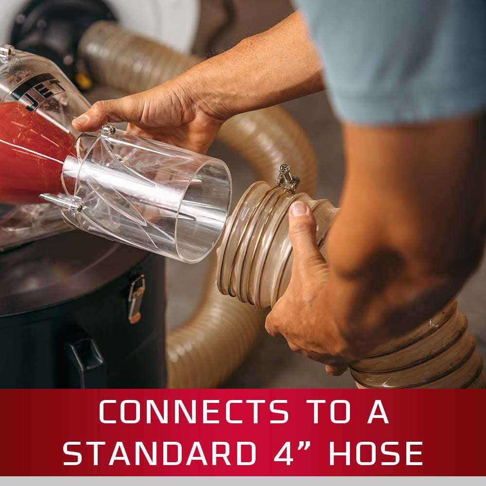 Features: Maintains the air flow of a dust collection system by deflecting chips and large debris inline, freeing up filters to trap finer particles. Extends the life of your filter and impellers by extracting the larger debris before it enters the dust collector. Can be placed on the lid of almost any size container (bolt pattern is included). Makes disposal of debris easier and cleaner. Clear polycarbonate material allows for viewing of separation. Details: The JET Cyclonic Separator maximizes dust collection efficiency by maintaining the air flow of a dust collection system by deflecting chips and large debris inline, freeing up dust collection filters to trap fine particles (for best performance, select cutterhead and cutting speed to produce chips 2″ or smaller). The red bullet separator deflects chips downward into a bin, reducing damage and obstruction to the dust collection hoses, impellors, and filters. The JET Cyclonic Separator can be placed on the lid of almost any size container (bolt pattern is included). Bring cyclonic power and efficiency inline.