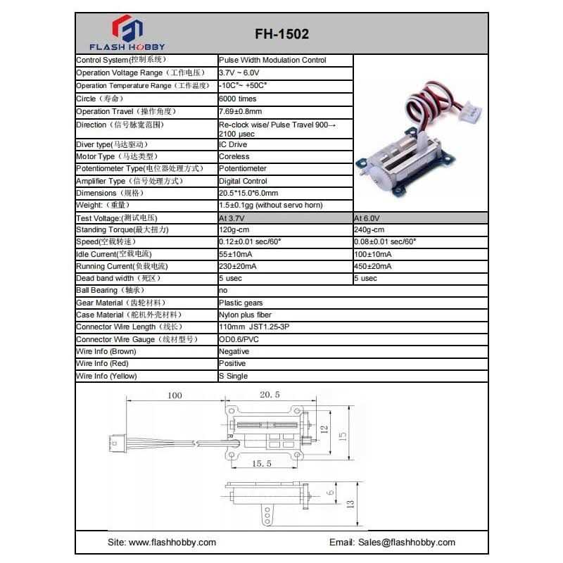 Model: FH-1502 digital. Torque: 0.08kg-cm. Speed: 0.12sec/60? at 3.7V. singal: 900-2100uS? frequency: 50-330Hz Motor: Coreless Motor. Find electronics, fashion, accessories, grocery and more.
