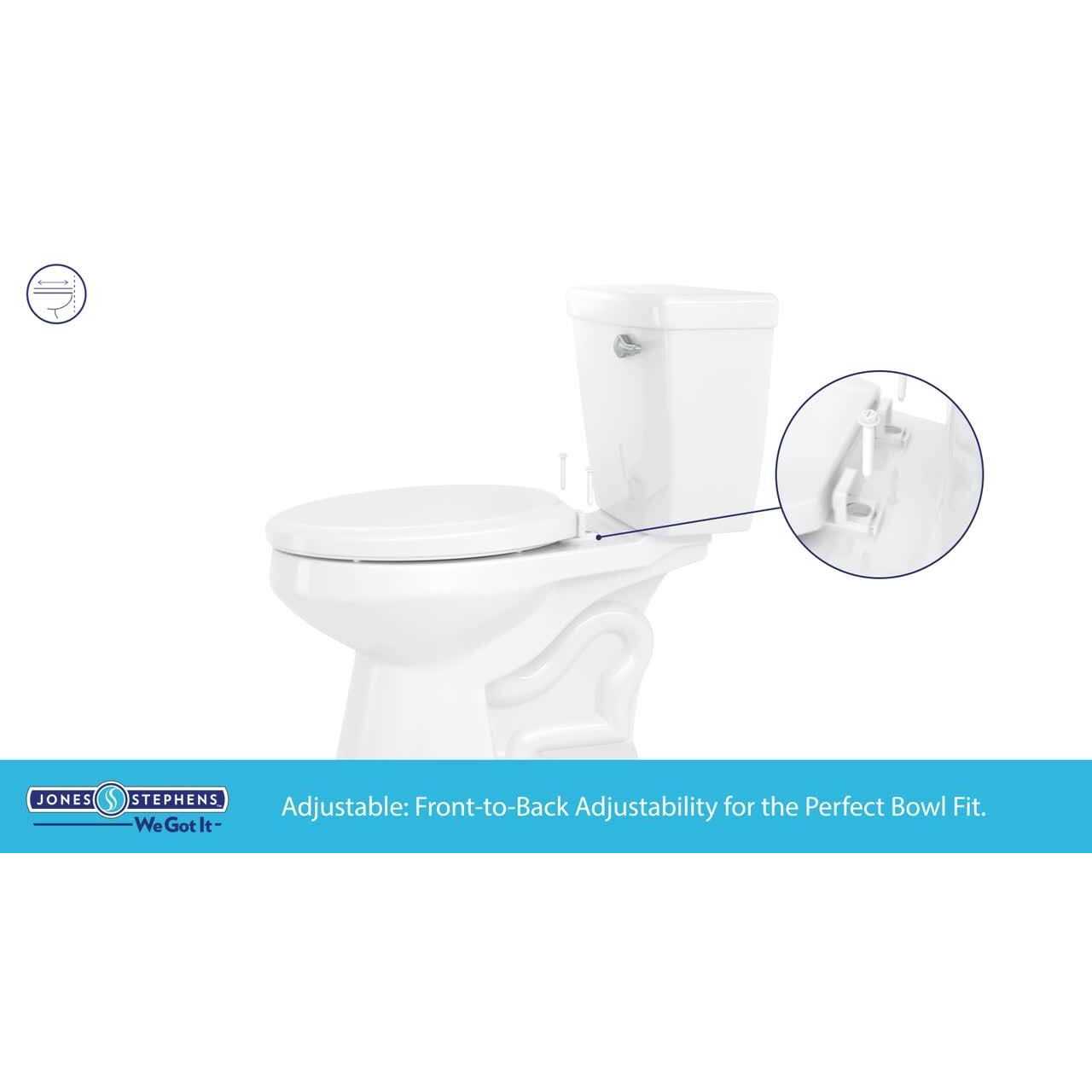 Jones Stephens residential wood toilet seats are known for their high quality, designer styles, innovative features, and consumer comfort. Crafted in durable molded wood, this toilet seat is finished in a multi-coat, high-gloss enamel paint with UV paint color protection. Four color-matching bumpers are positioned on the ring for added stability, and adjustable top-mount and coordinated hinges make for easy installation and use. The adjustable hinge allows for front-to-back positioning so the seat fits perfectly on the bowl. Made with the highest quality materials, Jones Stephens’ toilet seats provide the perfect fit and function for your bathroom design needs. Color: Regency Blue.