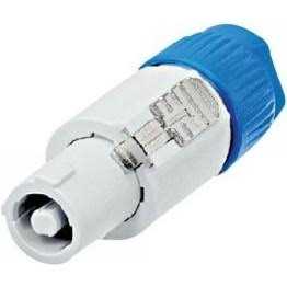 The Neutrik Powercon series of connectors provide a compact yet rugged solution for power connections. A uniquely keyed insert prevents then being used in wrong sockets and a twist-lock system keeps them in place in use. These are increasingly used in professional sound and lighting applications. The connectors are rated to 20A and are available in blue bodies, denoting a power inlet, and grey bodies, denoting a power outlet (or through) connection. These connections are not suitable for situations where disconnection under load would occur. For this, the Powercn True-1 system should be used.