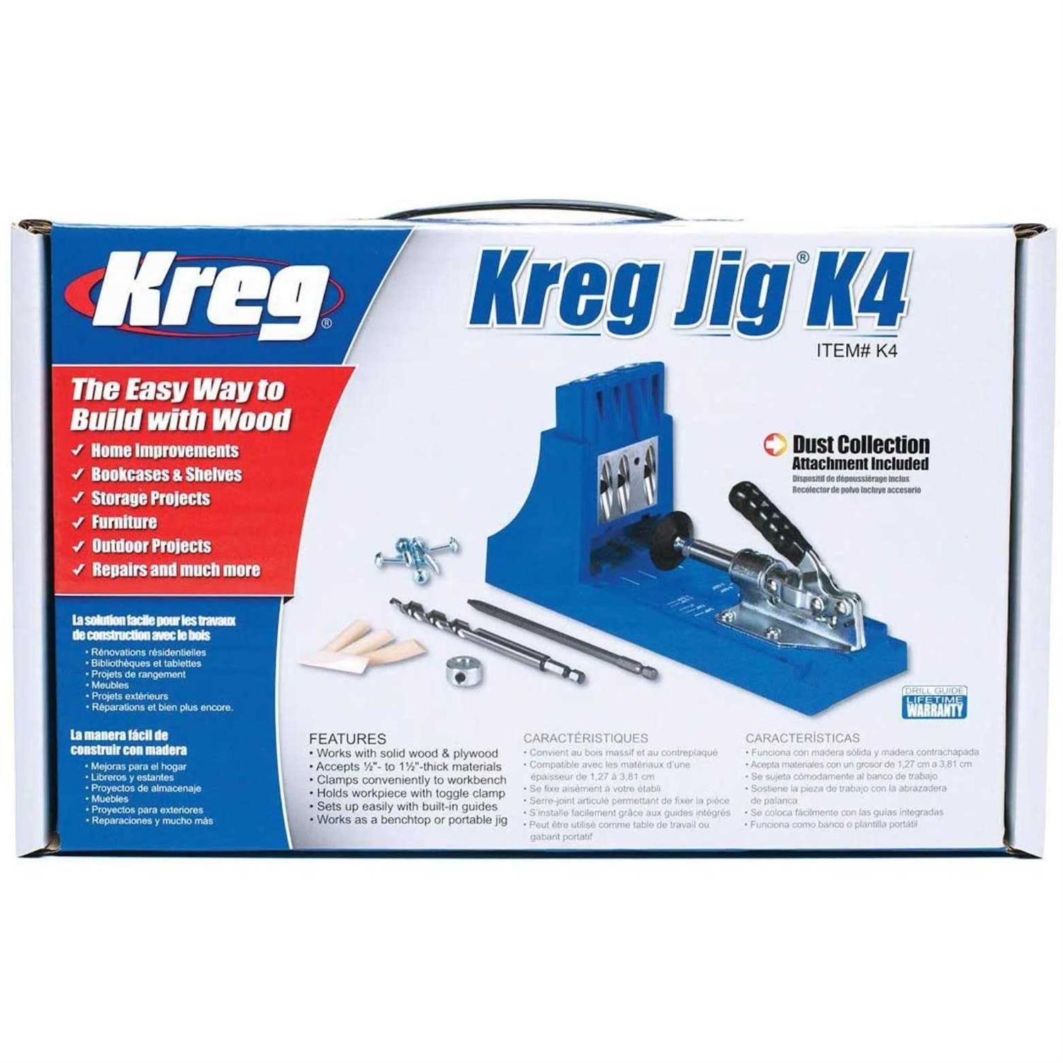 The Kreg JigK4 is the perfect choice for do-it-yourselfers and anyone new to pocket-hole joinery. Whether you are building your first set of garage storage shelves or making simple repairs around the house, the Kreg Jig K4 can help you finish the job in less time, and with far less effort than you ever thought possible. The 3-hole Drill Guide lets you make perfectly placed pocket holes in a wide variety of material widths and thicknesses—from 1/2 to 11/2 inches in 1/8 inch increments. Every KGuide features a hardened-steel core that carries a lifetime guarantee. The core shrouds the bit and supports the workpiece through 100% of the drill-stroke, resulting in minimal bit deflection, reduced tear-out, and a clean, pluggable pocket hole. The large clamping recess makes it easy to secure your jig to your workbench using Kreg multi-purpose Face Clamps or any common bar clamp or C-clamp.