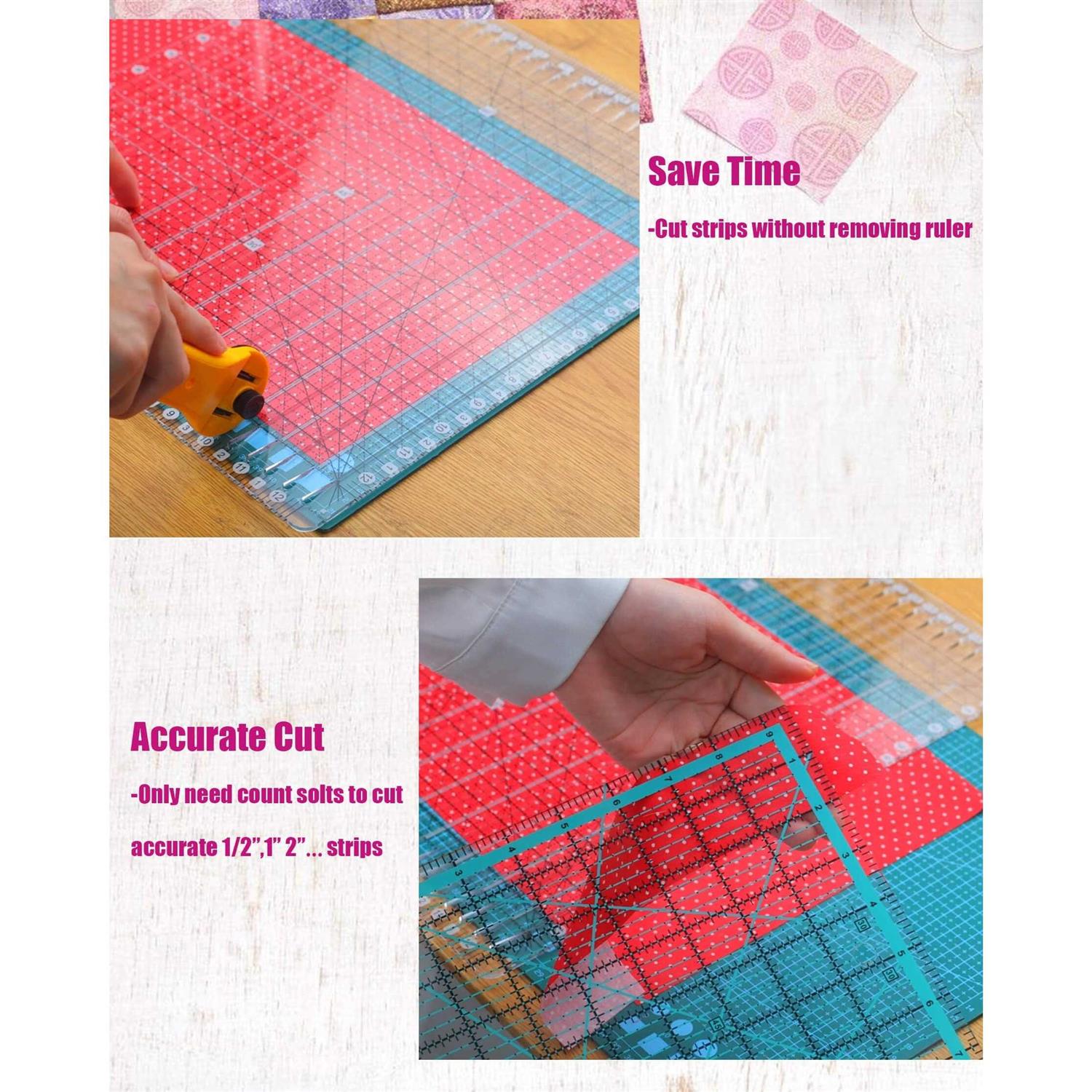 Easy to Read: This 12.5 by 12.5 inch quilting ruler is made of high clear transparent acrylic, double color sight lines and large print numbers that show up on light and dark fabrics. High clear acrylic to see through the sewing ruler for a precise cutting. Ruler to Save Quilting Time: Square up blocks up to 12 inches;there is a cutting groove each 1/2 inch increments, just hold the rotary cutter perpendicular to the ruler along the groove and cut carefully, you don’t need to remove while cutting,cutting several strips in one minute, it reduce rotary cutting time so much! Charming Shapes:It is very convenient and fast to use the 45 degree and 60 degree angles to cut binding(Stripes),squares, triangles, diamonds, trapezoids and parallelograms. Package:Ruler Dimension: 15inch*13inch, Comes with nonslip self adhesive silicone grips can help you avoid slippage of the ruler and template when using the rotary cutter, so that the cutting is safer and more accurate. Aftersales: If the products arrived broken,welcome to contact for a reasonable solution. Karpoulra Stripology Quilt Ruler Material: High clear acrylic SIZE: 12INCH BY 12 INCN Main application;Finish your patchwork -Quilting tool- convenient to cutting fabric into shapes. Package Include: Quilting Ruler X1, Non- Slip Grips 20pcs