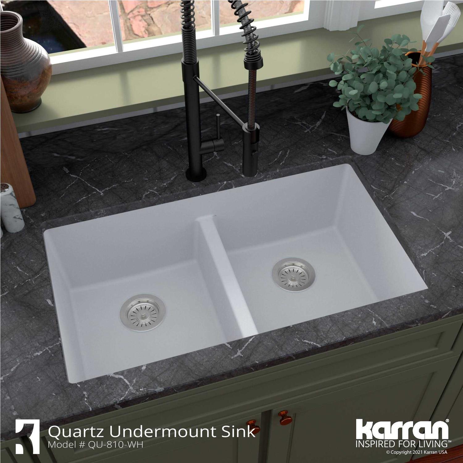 Karran 32″ Undermount Quartz Composite Kitchen Sink, 50/50 Double Bowl, White, QU-810-WH