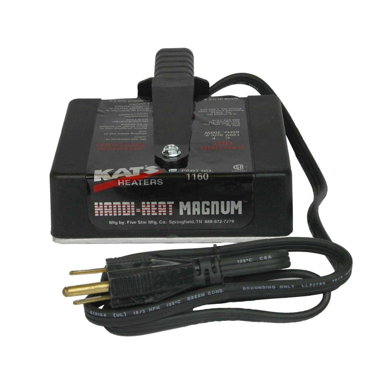The Handi-Heat Magnum provides 300F to 400F heat for heating or thawing engine blocks, oil pans and transmissions on trucks, tractors and other large vehicles. Heat Settings thermostatically controlled, Volts 110, Watts 300. Two powerful magnets offer 2 1/2 times the heating surface of Item# 17101 Allows faster, easier cold-weather starting also for tanks, snowblowers and snowmobiles. For warming hydraulic systems. For thawing frozen pipes and gutters Non-metallic grip.