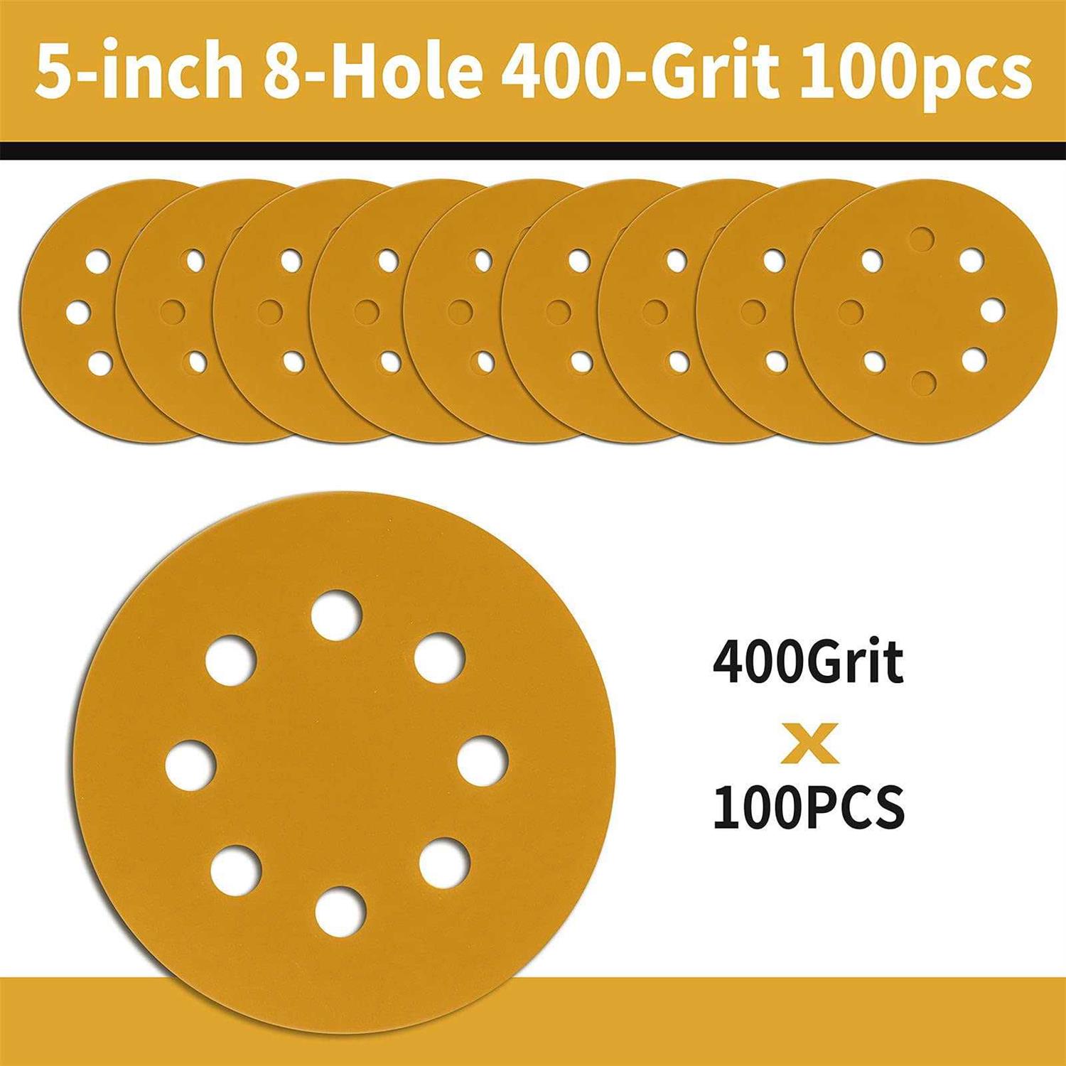 Keeimp 100 Pcs 5 inch Sanding Discs Hook and Loop, 8 Hole Gold Premium 400 Grit Dustless Random Orbit Sandpaper for Woodworking or Automotive