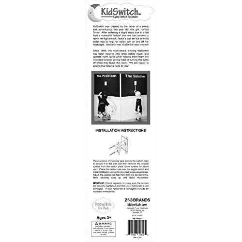 Kidswitch Light Switch Extender Kidswitch Light Switch Extender loops around the on-off light switch and hangs down so kids can switch on and switch off the light with ease. It also helps instill energy-saving habits in a fun way. Switch adapter is also available for easy connectivity. Why Youll Love It: Kidswitch Light Switch Extender builds confidence in kids and helps them feel less scared of the dark. Age: 3 years and up Features Helps kids reach the light switch Simple to install and use Glows in the dark Product Dimensions: 0.2 x 3 x 13.5 inches Model # KS-ORIG-1 Features: Allows toddlers, children to safely reach and operate lights. Helps with potty training – No more scary trips to a dark bathroom. Teaches energy saving habits. Builds self-confidence, self reliance and saves parents time! Also great for the elderly, disabled or those requiring a wheel chair. Can be installed in minutes by anyone and only requires a screwdriver. Item Dimensions: 14″ L x 3″ W x 0.25″ H