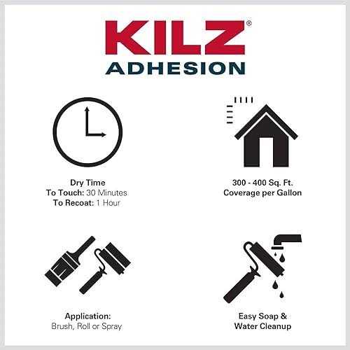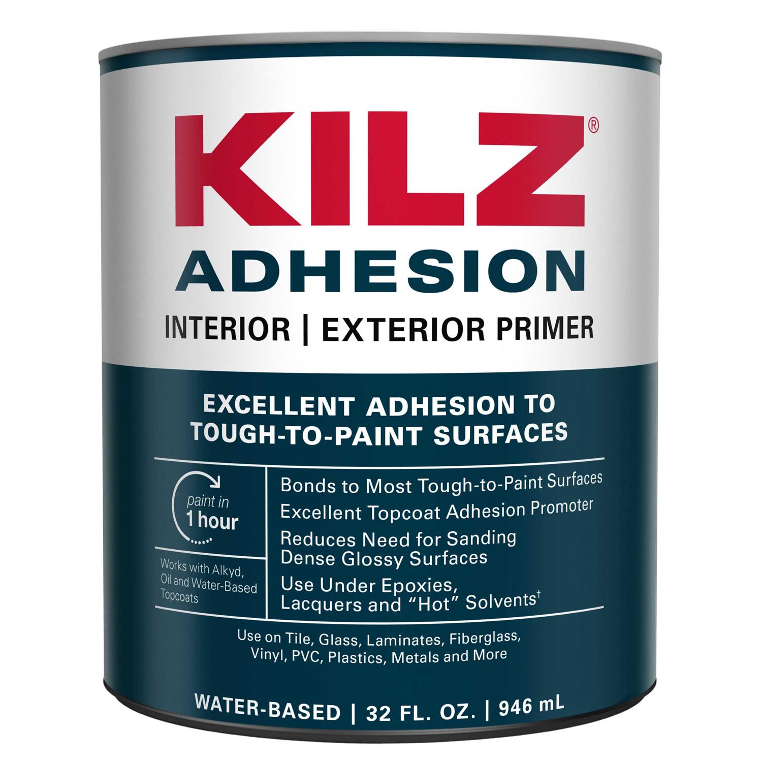 A good bonding primer is essential to ensure that topcoats adhere to tough-to-paint surfaces. High adhesion primer increases painting possibilities by bonding to a wide range of surfaces. KILZ Adhesion is a unique latex primer developed to bond securely on slick surfaces where a traditional water or oil-base primer will not adhere. Bonds to tough-to-paint surfaces including Kynar, PVC, Formica, vinyl, glass, tile, glazed brick, chalky paints, glossy finishes, fiberglass and metals. Topcoat with either latex or oil-based paint. Use on most interior and exterior surfaces where a secure bond is critical. This problem solving primer can be used under epoxies, lacquers, and products containing Xylene or other solvents. This is a 1-quart can of KILZ Adhesion High-Bonding Interior/Exterior water-based Primer in white. Covers approximately 300 square feet per gallon. Use on properly prepared surfaces free of dust, grease, chalk, mold, rust and peeling paint. Mix well before using. Apply with brush, roller, or spray. KILZ Adhesion dries to touch within 30 minutes and ready to recoat in an hour. KILZ has been making premium primers and paints for 40 years. KILZ was named Paint Brand of the Year in 2015 in the Harris Poll EquiTrend Rankings.