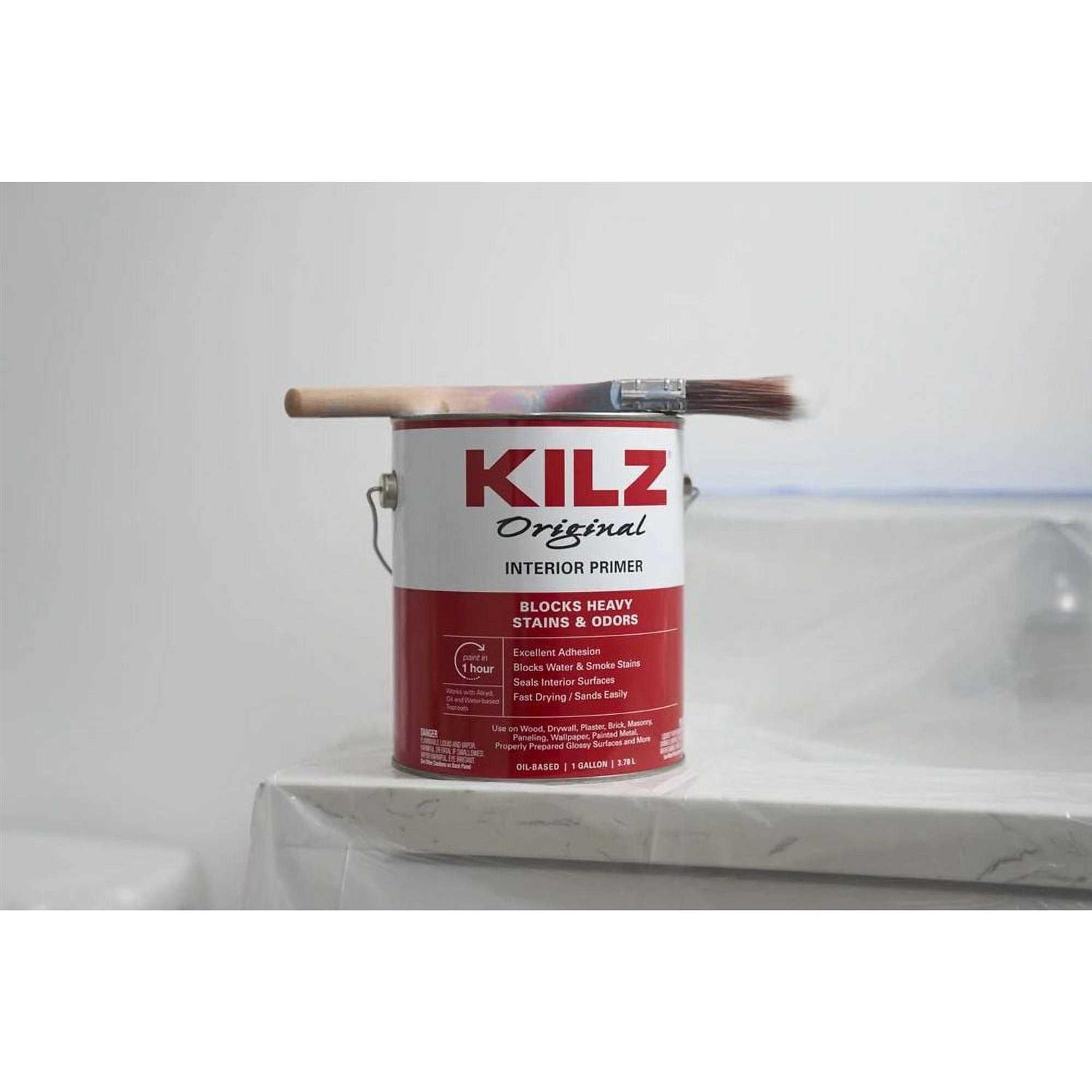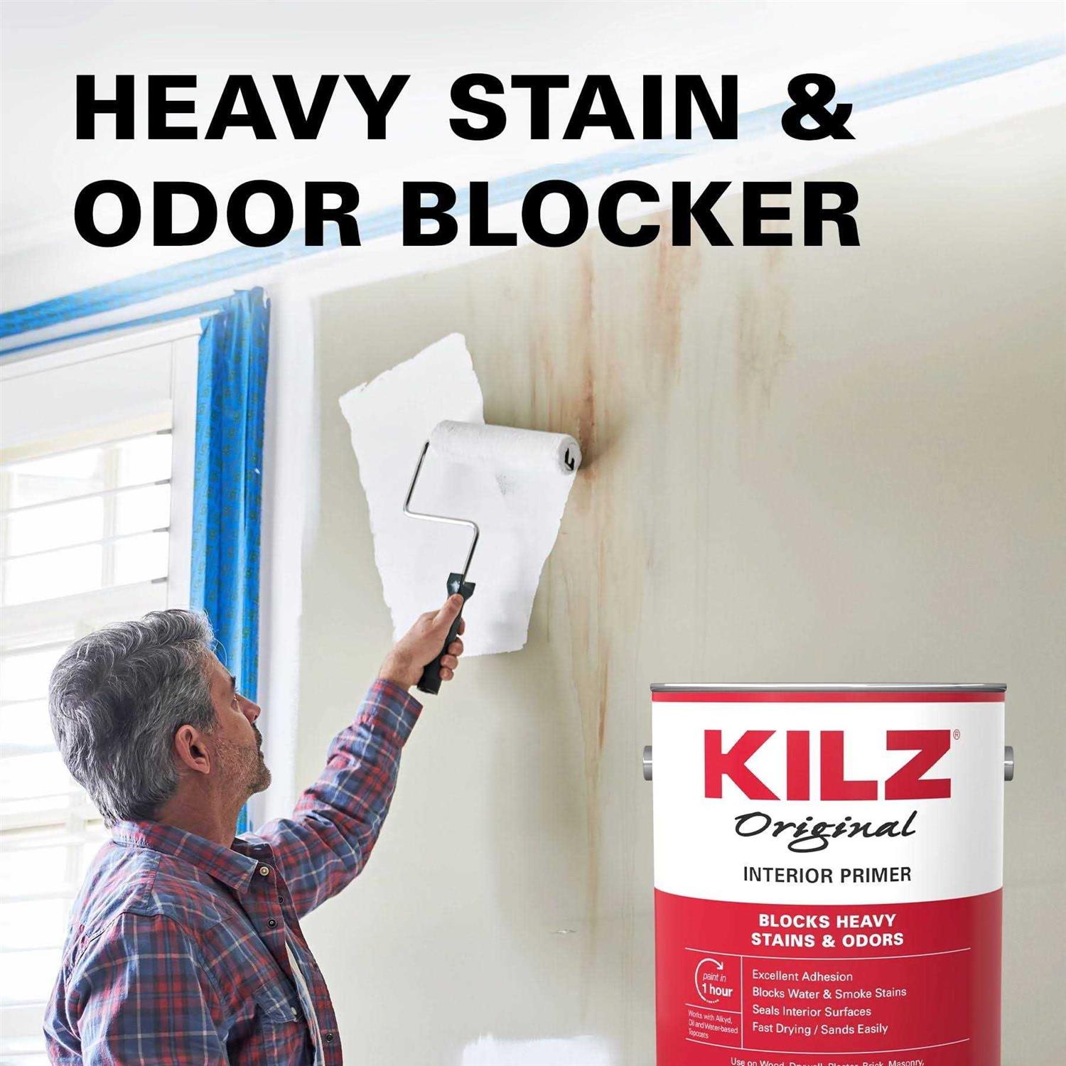 KILZ ORIGINAL Primer is a powerful stainblocking formula that blocks most heavy interior stains including water, smoke, tannin, ink, pencil, felt marker, grease, and also seals pet, food and smoke odors. Trusted by pros for over 40 years, it has excellent sealing and adhesion properties help paint adhere to most interior surfaces leading to better results. Use on wood, drywall, plaster, paneling, wallpaper, masonry, brick, painted metal and properly prepared glossy surfaces†. Not recommended for mold or mildew-prone surfaces or on flooring.