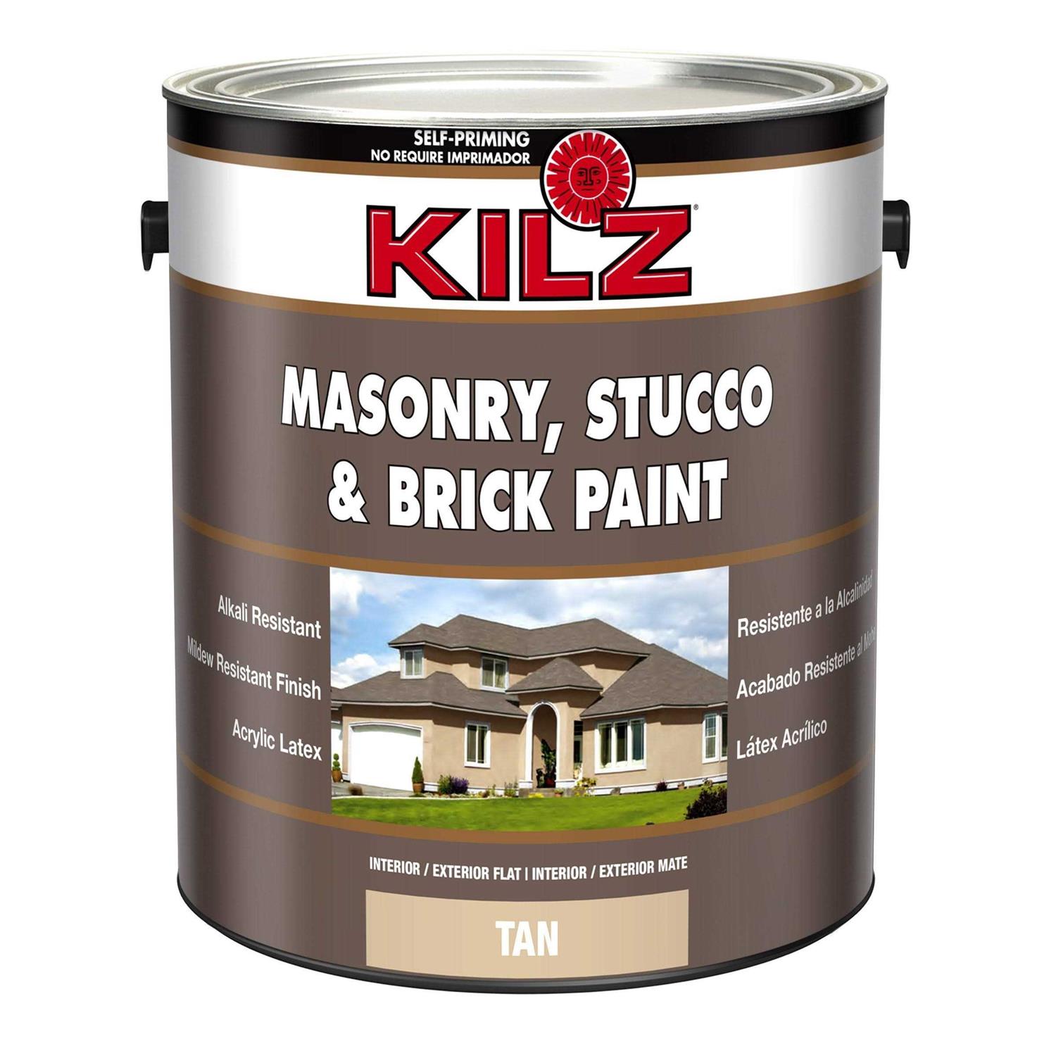 This high-quality acrylic latex water-base interior/exterior paint offers excellent hiding properties with great adhesion and water repellency on textured interior and exterior surfaces. This self-priming paint offers a mildew resistant finish on properly prepared smooth rough and textured masonry drywall stucco and brick surfaces. It is alkali-resistant up to pH 12.0 easy to apply and cleans up with soap and water. This formula is designed to accentuate all textured surfaces while achieving a natural look. This is a 1-gallon can of KILZ Interior/Exterior Concrete Brick and Tile Paint in tan with a flat finish. Covers 250-400 square feet per gallon depending on surface texture. All surfaces must be clean free of dust chalk oil grease wax polish mold and mildew stains loose and peeling paint rust and all other foreign substances. This paint can be rolled brushed or sprayed on. KILZ has been making premium primers and paints for 40 years. KILZ was named Paint Brand of the Year in 2015 in the Harris Poll EquiTrend Rankings.