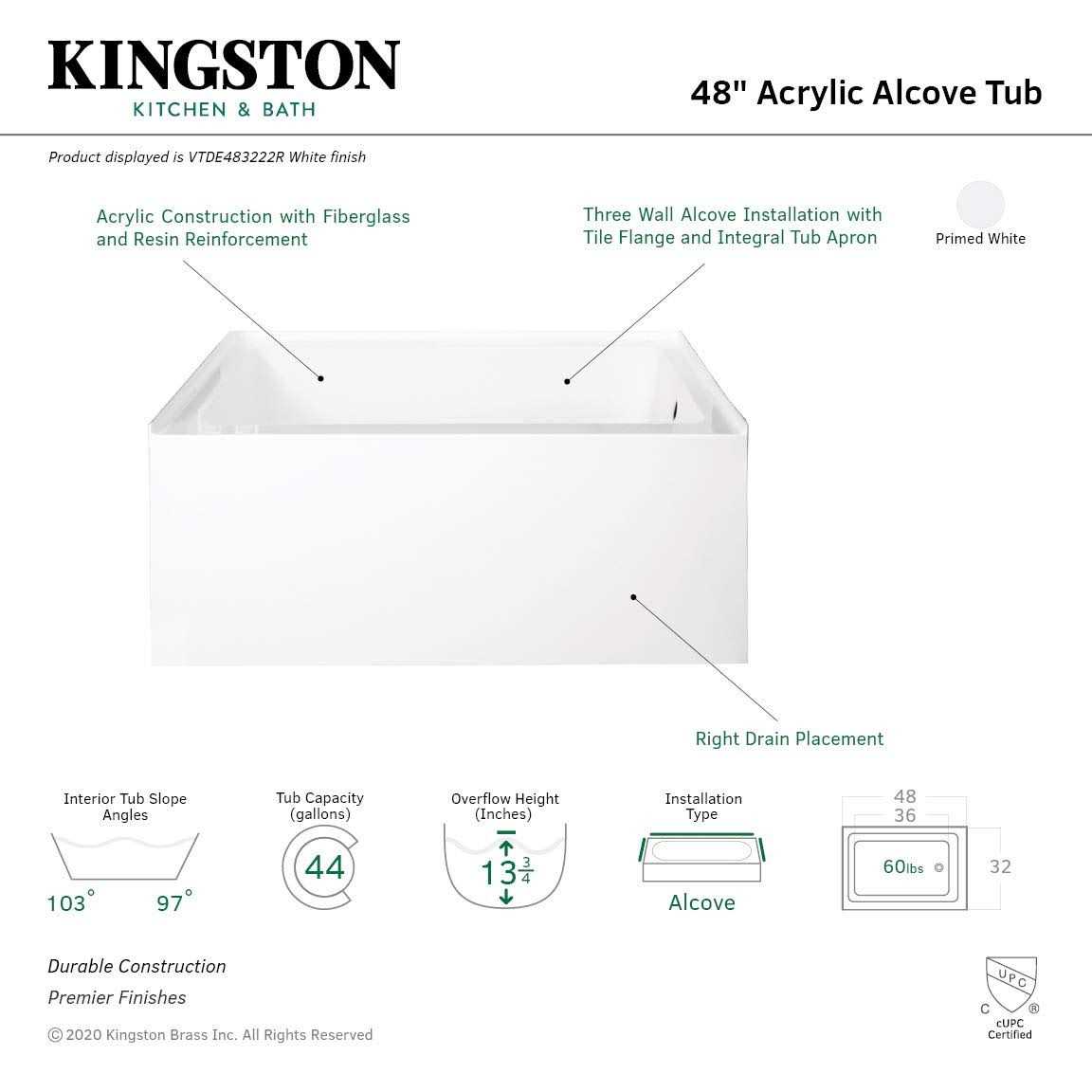 Kingston Brass Aqua Eden VTDE483222R Ambry 48-Inch Acrylic Alcove Tub with Right Hand Drain Hole