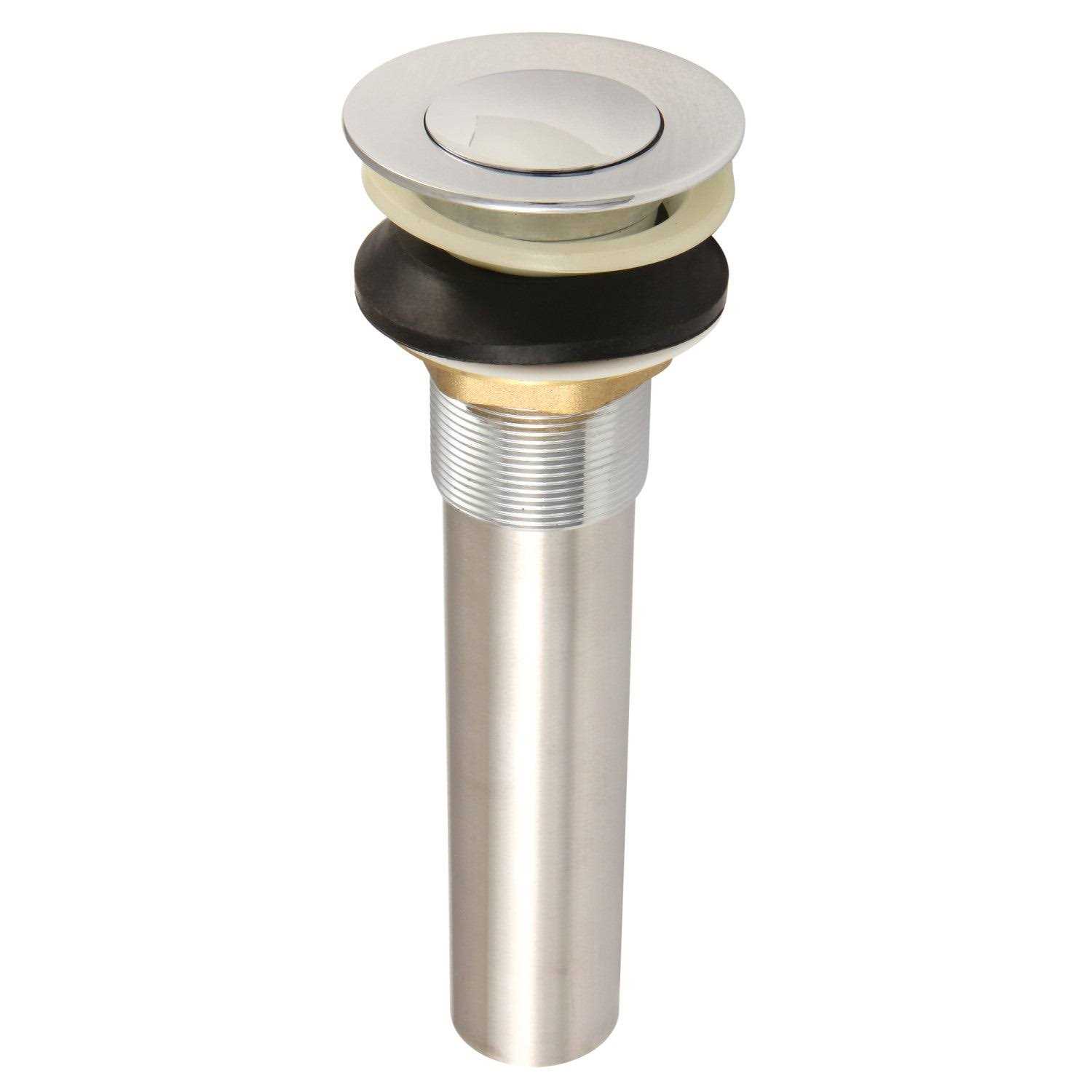Push-up bathroom drains feature a spring mechanism to easily close and open the fixtures. Available in multiple finishes to match your faucet, the Complement Push-Up Drain With Overflow will fit standard bathroom sink sizes.