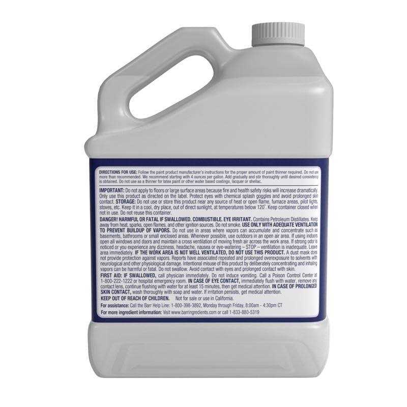 SKU 4550132 – Real mineral spirits thin oil-based paint, stains, and varnishes. Will also clean up paint spills, oversprays, brushes, tools, and equipment. Please consult packaging for instructions and follow all safety procedures.