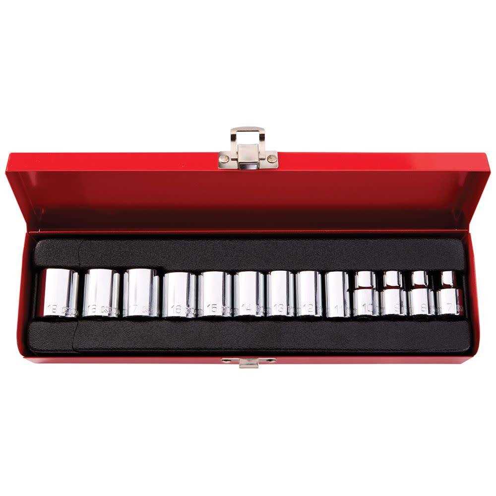 - Thirteen 6-point sockets: 7, 8, 9, 10, 11, 12, 13, 14, 15, 16, 17, 18, and 19 mm