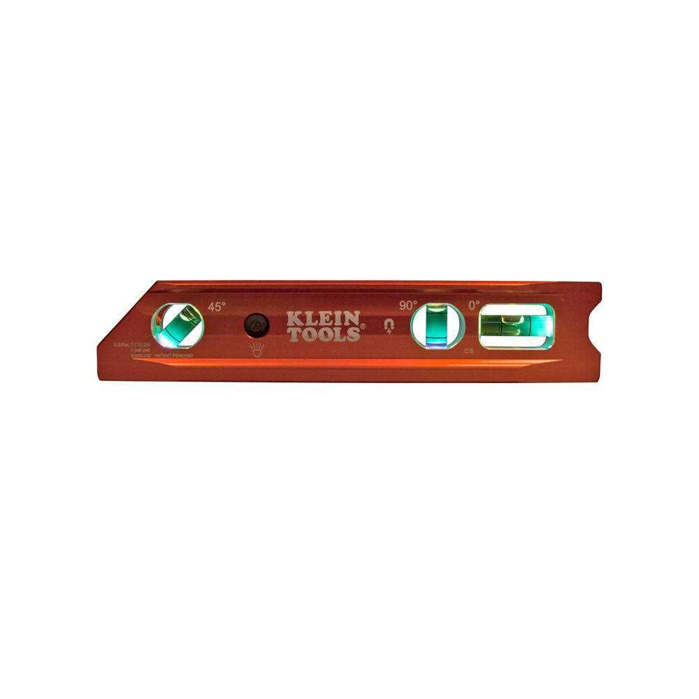 The Klein Tools 9-Inch Lighted Aluminum Billet level is designed for effective leveling on and off the construction site. The patented Magnet Track keeps the powerful Rare-Earth magnets secure and ensures that they won’t fall out. This leveler also includes large, easy-to-read vials and vial windows for easy viewing at any angle. The vials are also brightly illuminated by the LED lights to ensure easy reading in all light conditions. The V-groove fits snugly into pillars, posts, conduit, pipe, and any other round surface. The tapered nose slides into pockets and corners. Whether you’re a carpenter, electrician, plumber, drywall installer, DIY enthusiast, or professional tradesperson, the Klein Tools Cat. No. 935RB can help make your leveling tasks easier.WARNINGAlways wear approved eye protection.