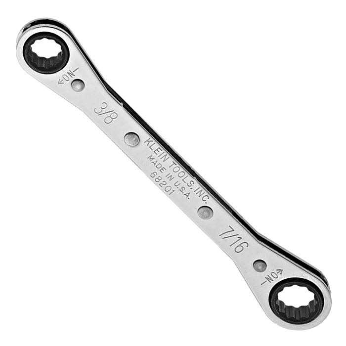 The Klein Tools Ratcheting Box Wrench is great for working in confined spaces and on long studs. This wrench has a different size opening on each end for multiple applications. Get reverse ratcheting action simply by turning the wrench over.