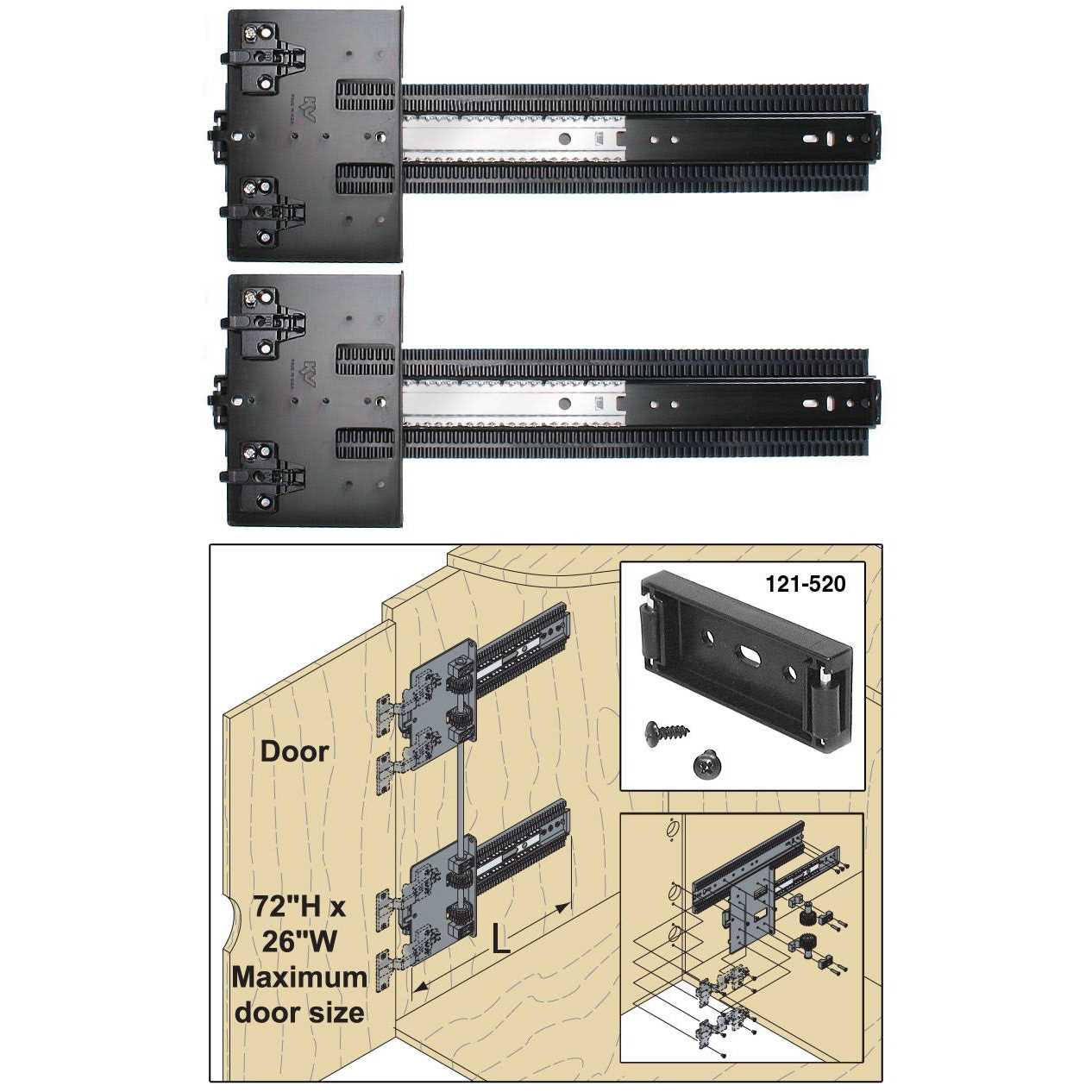 Ideal for use in large entertainment and home theater cabinets with oversized doors, this system features rack and pinion design with multiple hinge options. |
