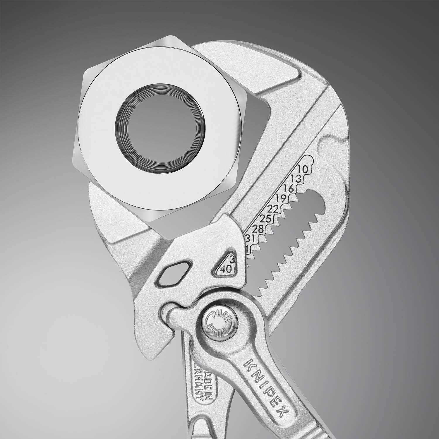 The KNIPEX Pliers Wrench is a fantastic tool for fastening, gripping, holding, and bending. Its slim profile allows easy access to confined spaces, making it one of the most versatile tools. Its parallel smooth jaws avoid damaging soft or plated materials and provide even, full-contact gripping. Unlike an open-end wrench with uneven compression that can cause surface damage, this KNIPEX pliers wrench offers zero backlash under pressure. With a 10-to-1 lever ratio, the cam action design ensures a strong and secure grip. The self-ratcheting action allows for fast, easy operation while eliminating the need for additional tools. This tool features recessed areas for a better grip and laser-etched markings in both metric and imperial. This feature is key in determining the jaw opening before setting the wrench on the fastener easily and quickly with a simple push of a button. All of KNIPEX’s Pliers Wrenches feature a pinch guard to prevent operators’ fingers being pinched.