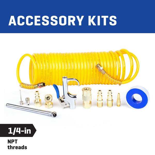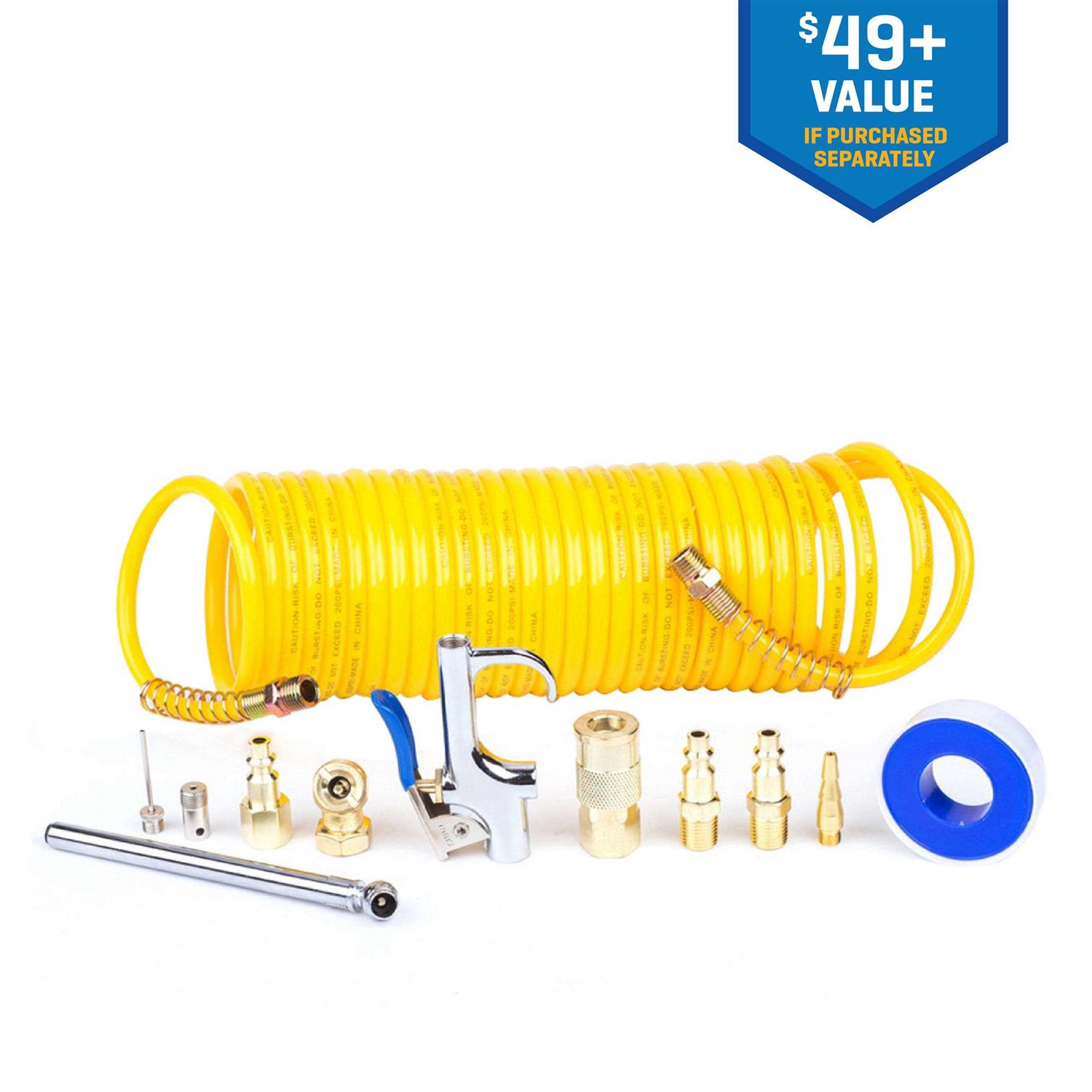 Featuring Industrial (I/M) solid brass coupler and plugs with ¼” NPT threads for easy compatibility and thread sealant tape to create airtight seals, preventing leaks when using the fittings. Plus, the kit has a 1/4-in x 25-ft nylon recoil hose that retains its shape, resists tangling, and has built-in bend restrictors to prevent kinking. The included blow gun and attachments make easy work of cleaning and inflation tasks around your workspace or garage. And tire maintenance is a snap with the tire gauge and ball chuck, allowing you to check tire pressure and inflate tires with ease. Make the most of your air compressor setup with this versatile and convenient kit!