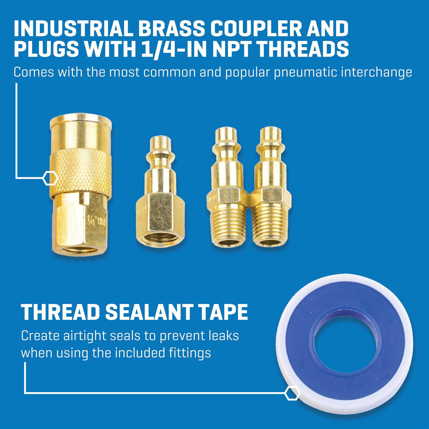 - Industrial (I/M) solid brass coupler and plugs with ¼” NPT threads – Comes with the most common and popular pneumatic interchange