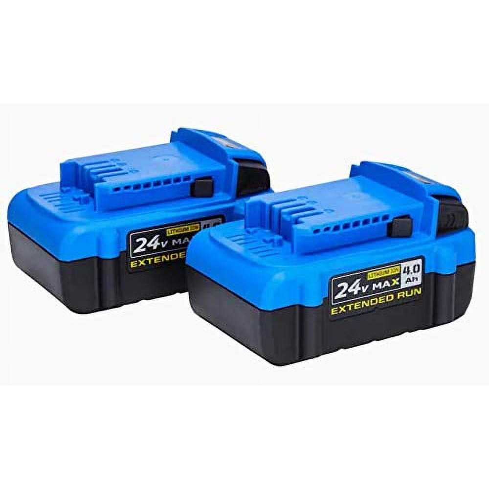 Kobalt 24-volt max 4.0-Ah Li-ion battery provides more power and runtime, so you can get the job done fast. This set includes (2) 24-volt 4.0Ah batteries. The power indicator keeps you informed as to how much battery is remaining before needing to be charged. The internal circuitry protects the battery pack from extreme temperatures, over-discharge, and over-charge for longer life.