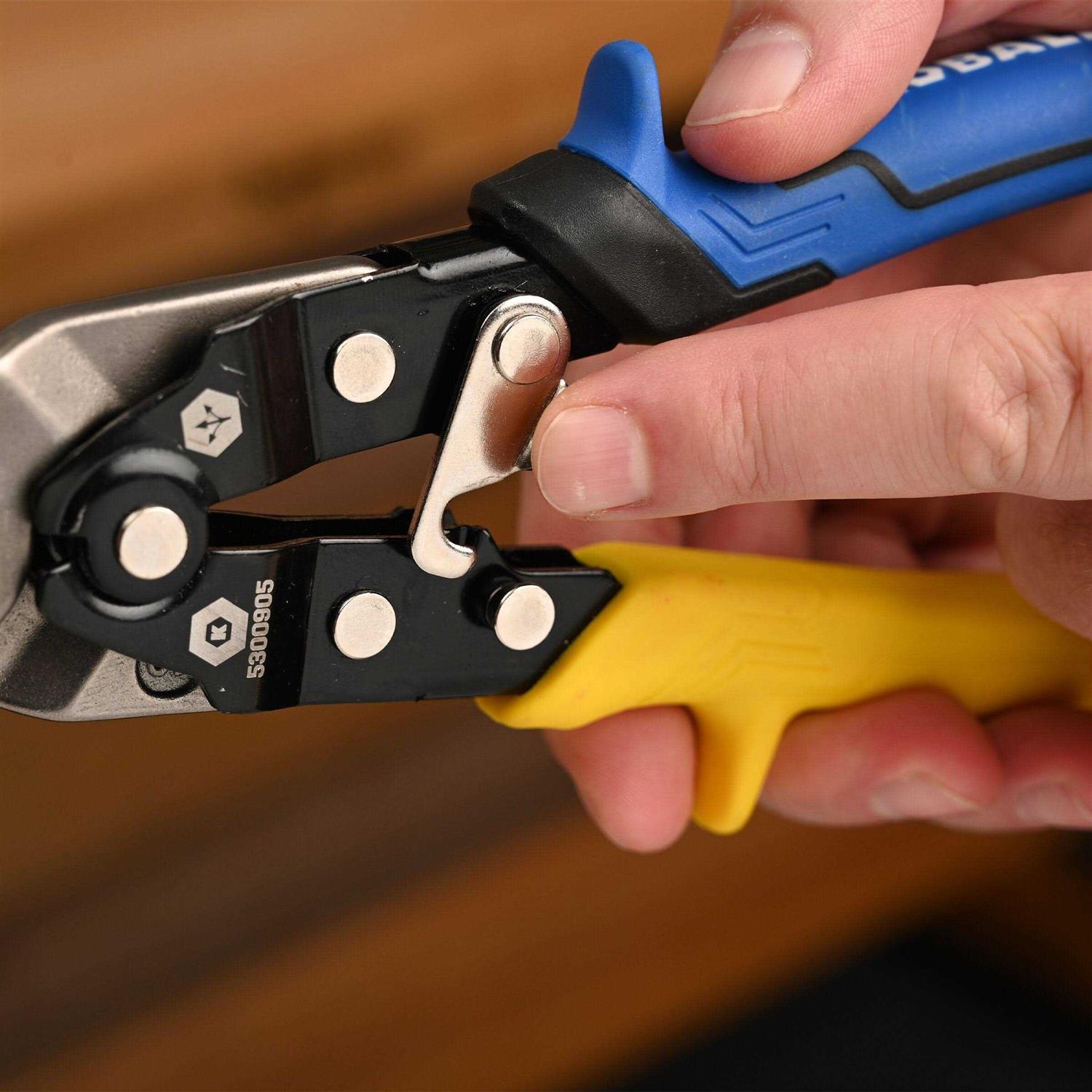 Straight cut aviation snips are designed to cut various thicknesses of stainless and cold-rolled steel. Induction hardened cutting edge stays sharp longer. Blade markings for quick precise cuts. The metal lock secures the tool for storage and is easily operated with one hand. Ergonomic non-slip grips provide excellent control and easy cleaning. Perfect for straight cuts.