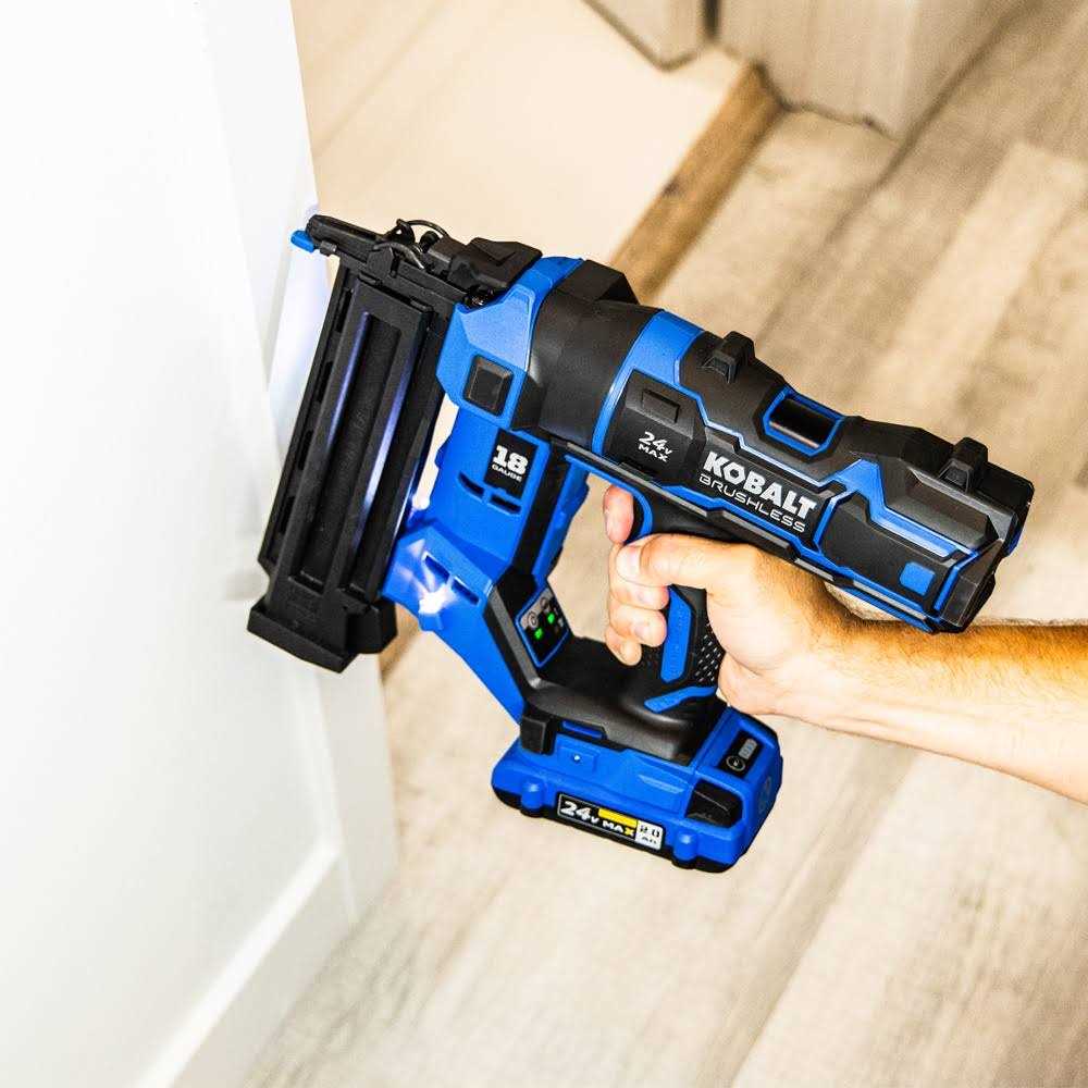 The Kobalt XTR 18-Ga Brad Nailer is the perfect tool for most applications such as residential trim work, cabinetry, furniture, and similar finishing applications. This tool is equipped with a pre-charged internal gas chamber to drive a piston which gives the user a similar feel to traditional pneumatic nail gun performance while eliminating the pain point of dragging an air compressor and hose around the jobsite. The XTR nailer delivers repeatable depth of drive due to the nearly instant reload technology so the user does not experience improperly sunk nails due to low air compressor lag. The 18-Ga nailer is equipped with an electronic control panel that allows the user to easily turn the tool ON with the touch of the power button. The user can also easily choose from sequential or contact actuation (bump) mode using the control panel. This cordless nailer delivers on all the features you would expect from a premium performance nailer including the ability to accept 5/8-in to 2-1/8-in long brad nails, 110 nail magazine capacity, tool-free drive depth adjustment, dry-fire lockout, tool-free jam clearing mechanism, magazine site window, and no-mar pads to protect the workpiece.