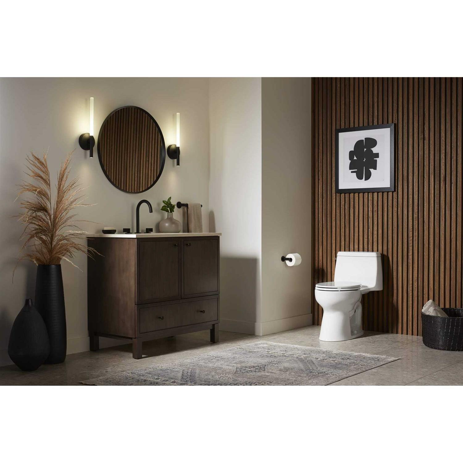 The one-piece design of this Santa Rosa toilet adds a contemporary look to your powder room. Perfect for smaller bathrooms and powder rooms where space is at a premium, the compact elongated shape takes up the same space as a round-bowl toilet, yet its elongated shape adds added comfort. Its 1.28-gallon high-efficiency flush provides water savings of up to 16,500 gallons per year versus an old 3.5-gallon toilet, without sacrificing performance. Revolution 360 swirl flushing technology keeps the bowl clean longer and combines with ContinuousClean ST system to dispense cleaning solution with every flush. Chair-height compact elongated seat makes it comfortable to use, and a Quiet-Close seat is included.