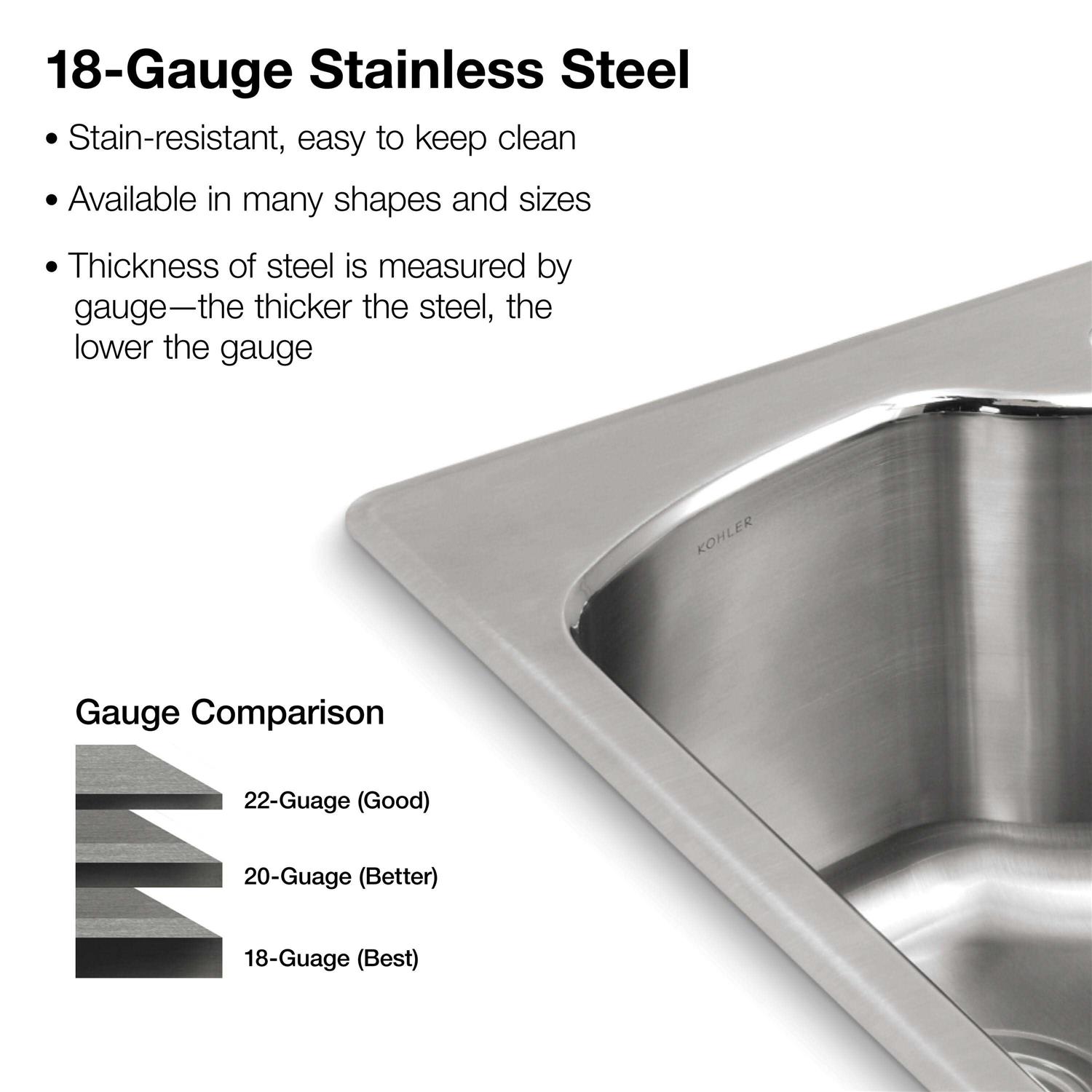 With its unique curved basin shape and deep double bowls Octave has a sleek convenient design that easily accommodates larger pots and pans. An engineered sound-absorption system significantly reduces disposal and dishwashing noise for a quieter kitchen environment. Octave is crafted from thick premium 18-gauge stainless steel for exceptional durability and universal style.