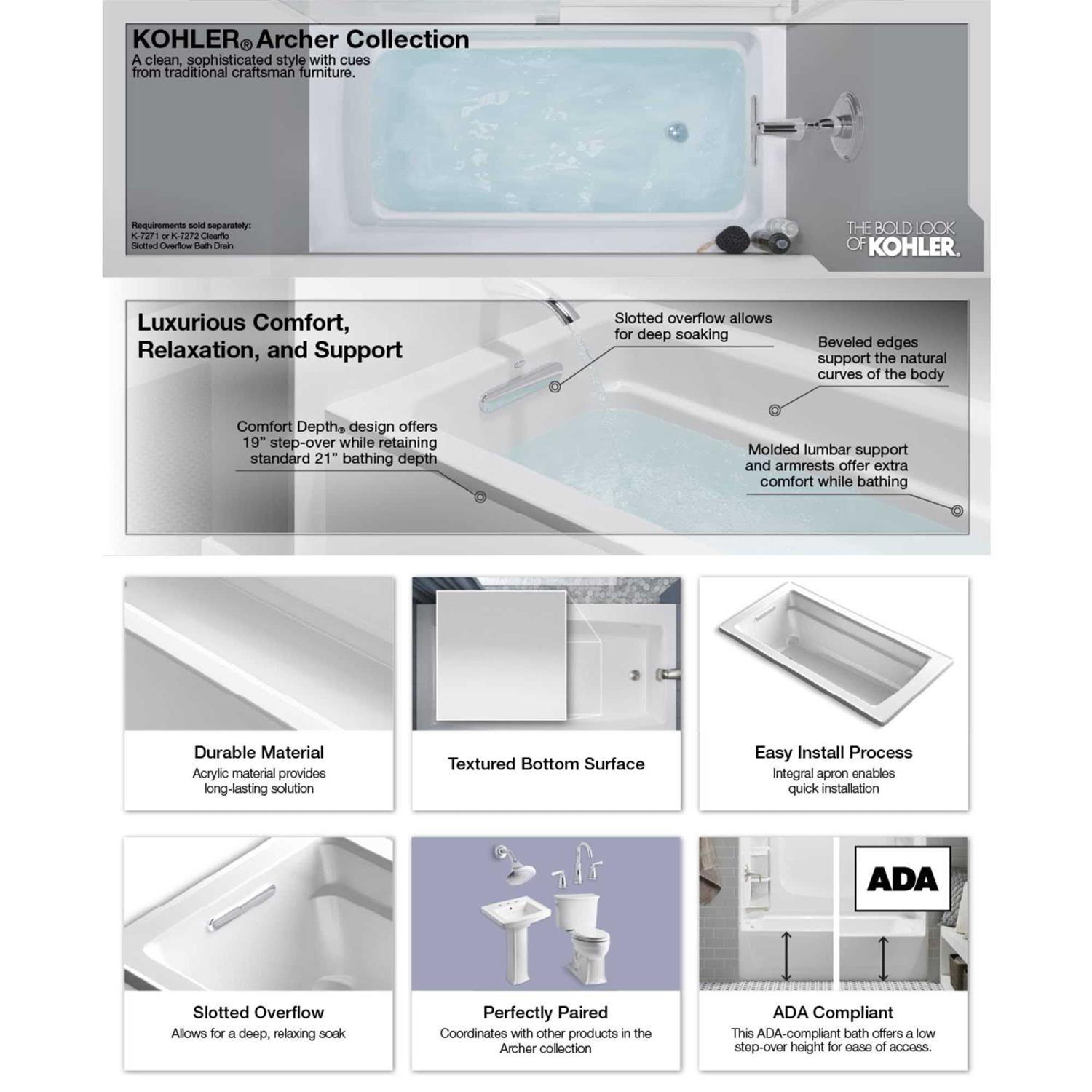 Taking its design cues from traditional craftsman furniture, the Archer line of baths reveals beveled edges and curved bases for a clean, sophisticated style. This bath offers a low step-over height while allowing deep, comfortable soaking. A lumbar arch gently support the natural curves of your body. KOHLER ExoCrylic is the next generation of bathroom acrylics, featuring a lighter weight for easier installation and 90% fewer VOCs produced during manufacturing.