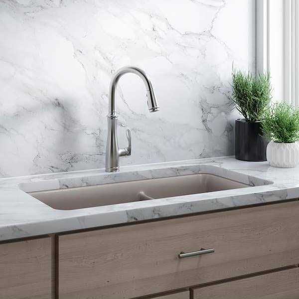 With its sleek look and innovative features, this Bellera pull-down kitchen faucet combines an elegant, versatile design with exceptional ergonomics and functionality. The high-arch spout rotates 360 degrees and reaches over the tallest pots, while the compact, three-function sprayhead pulls down into the sink for up-close tasks, or out of the sink to fill pots. Sweep spray creates a wide, forceful blade of water for superior cleaning. Kohler’s new docking system, DockNetik, secures the pull-down sprayhead to the spout using magnetic force.