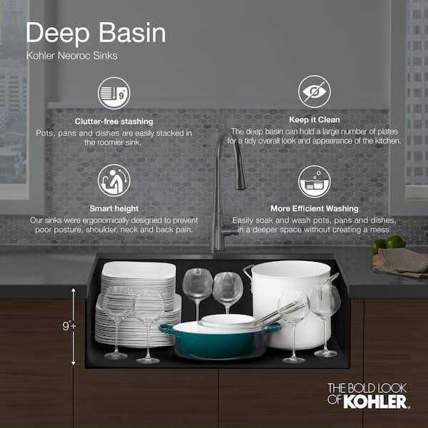 - KOHLER Neoroc composite is durable and built to withstand day-to-day cleaning tasks.