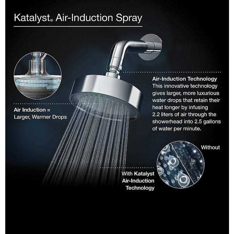 Enjoy a shower that simulates the soaking deluge of a warm summer downpour. This contemporary-style rainhead features innovative Katalyst air-induction technology, which efficiently mixes air and water to produce large water droplets and deliver a powerful, thoroughly drenching overhead shower experience. Its clean good looks and durable finish coordinate with many other KOHLER faucets and accessories.