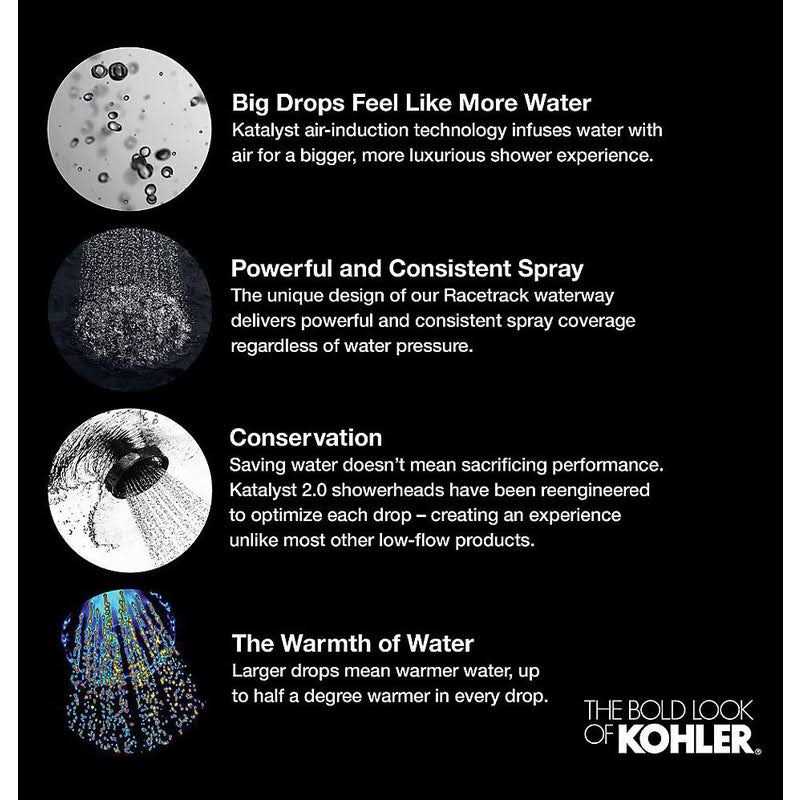Enjoy a shower that simulates the soaking deluge of a warm summer downpour. This contemporary-style showerhead features innovative Katalyst air-induction technology, which efficiently mixes air and water to produce large water droplets and deliver a powerful, thoroughly drenching overhead shower experience. Its clean good looks and durable finish coordinate with many other KOHLER faucets and accessories.