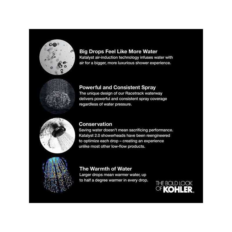 Enjoy a shower that simulates the soaking deluge of a warm summer downpour. This contemporary-style showerhead features innovative Katalyst air-induction technology, which efficiently mixes air and water to produce large water droplets and deliver a powerful, thoroughly drenching overhead shower experience. Its clean good looks and durable finish coordinate with many other KOHLER faucets and accessories.