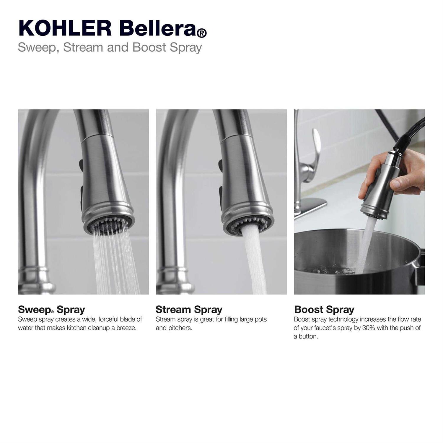 Distinguished by an elegant silhouette, this Bellera pull-down faucet brings professional-level style and performance into home kitchens. The high-arch spout with an industrial-inspired spring coil design swivels 360 degrees for a complete field of reach. A three-function spray head with touch control pulls down into the sink for powerful cleaning with Sweep spray, or out of the sink to fill pots and pitchers quickly with Boost function.