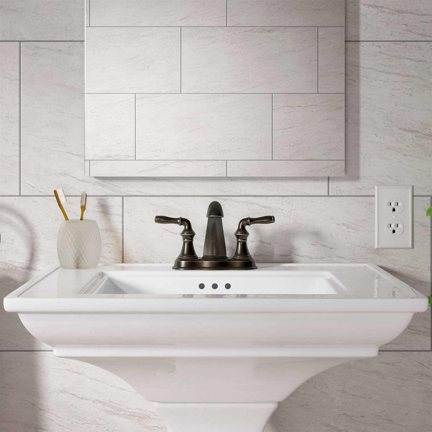 Featuring a classic silhouette, this Devonshire sink faucet complements a variety of bathroom decors. The faucet features ergonomic sculpted lever handles for easy control. A spout and matching pop-up drain with a tailpiece completes the set. Completes Devonshire design solution with Kohler fixtures and accessories. Premium material construction for durability and reliability. Kohler finishes resist corrosion and tarnishing. Kohler ceramic disc valves exceed industry longevity standards for a lifetime of durable performance. 1.2 GPM maximum flow rate. 5-3/16″ overall faucet height. 4-3/4″ spout reach. Two-hole installation for 4″ centers. 1/2″ – 14 NPSM inlet connections.