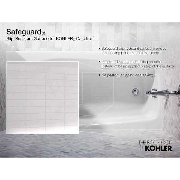 Kohler Villager Cast Iron Alcove Bathtub – For Ultimate Relaxation The Kohler Villager 5′ white alcove bathtub is a beautiful and reliable bathroom fixture that is designed for a single occupant at a time. Coated with enamel, this bathtub is highly durable and resistant to impacts. With the Safeguard finish, you will never have to worry about slipping in the tub. This walk-in bathtub features a drain on the left side. You can add matching feet coasters, a faucet, magazine racks, caddies and soap dishes to complement the look.