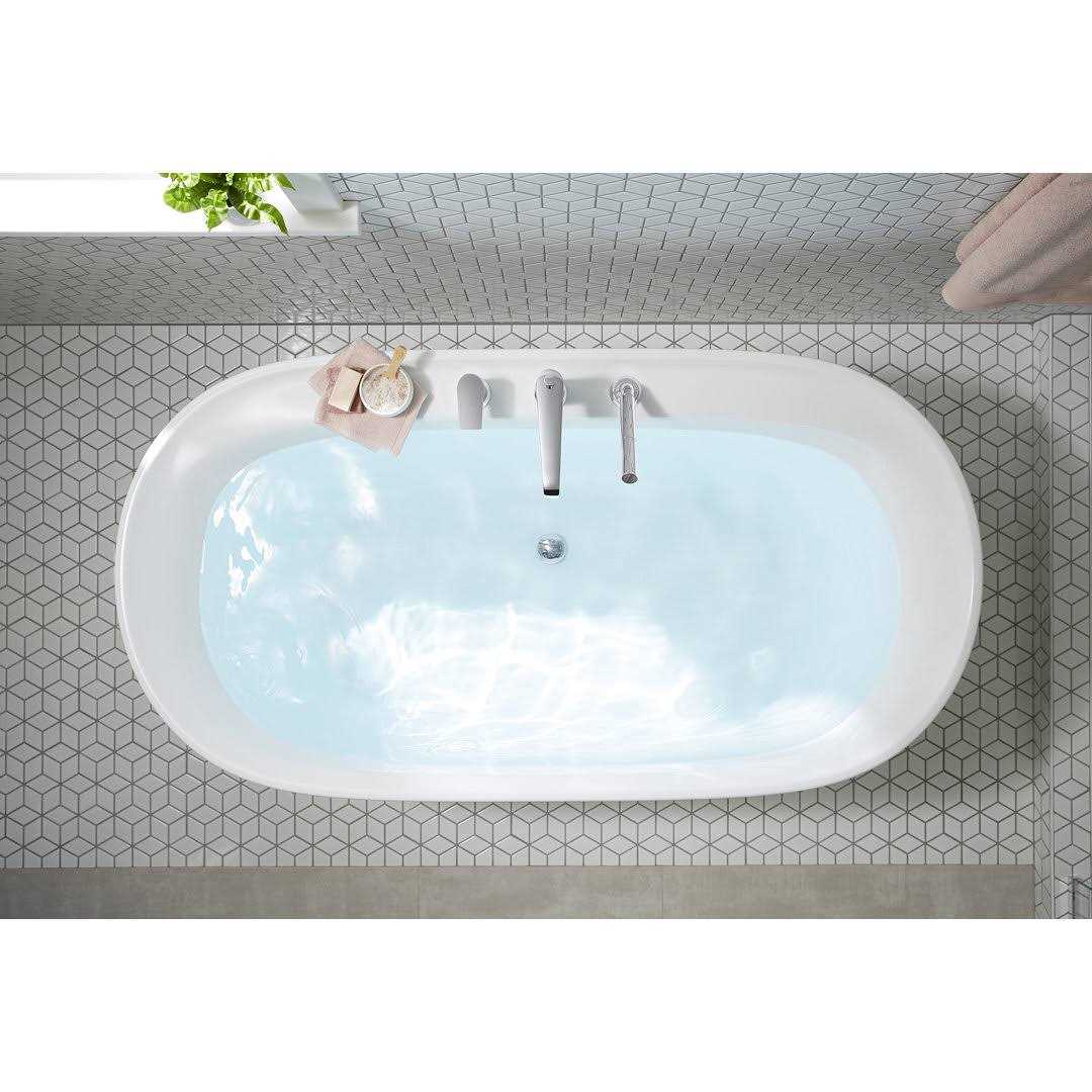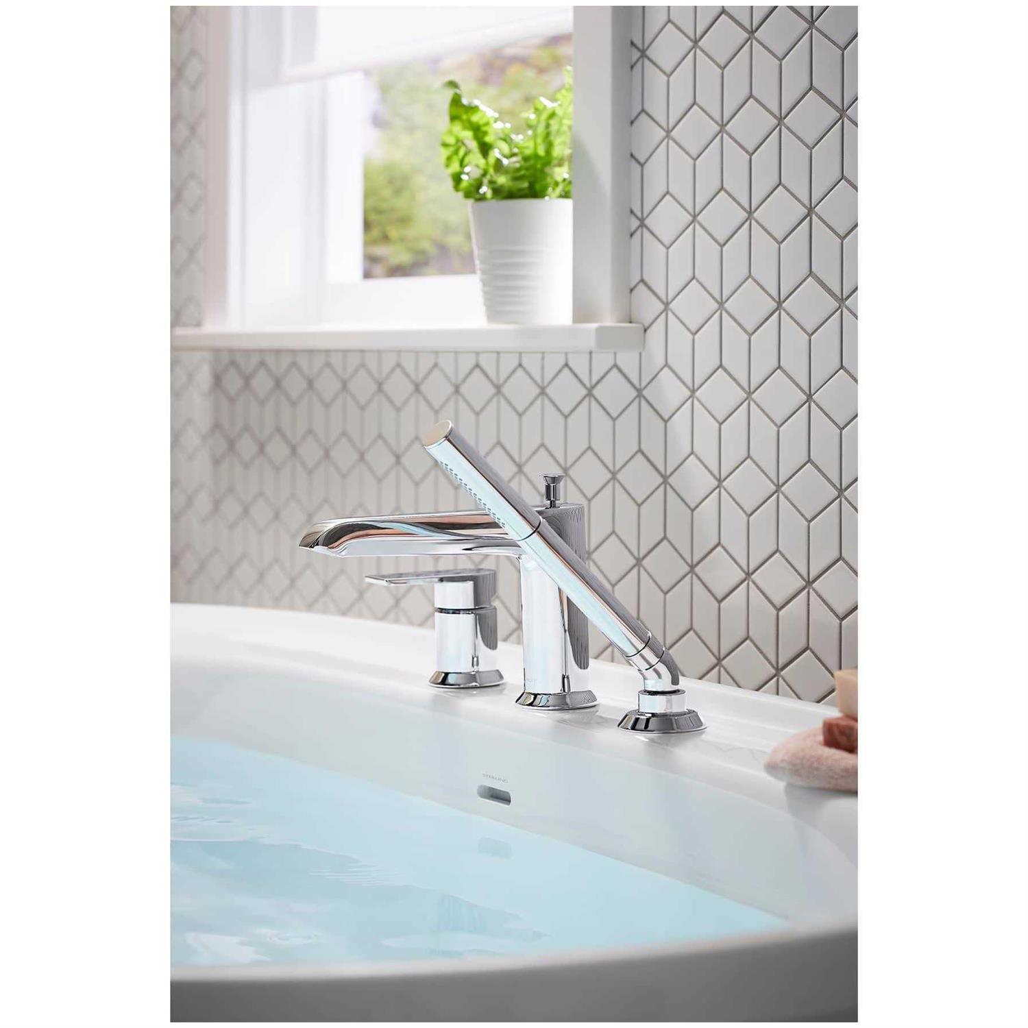 Minimalist in its design, the Hint bathroom faucet collection is a versatile style choice for traditional or contemporary environments. Coordinate with KOHLER Pitch showering components, and create a space that will look beautiful for years to come. This deck-mount bath faucet includes a handshower to enhance your bathing options. FEATURES Single lever handle allows for both on/off activation and temperature setting. Remote-valve handle allows for ease of access. Diverter spout. KOHLER ceramic disc valves exceed industry longevity standards for a lifetime of durable performance. MasterClean sprayface resists hard water buildup and is easy to clean. Temperature memory allows faucet to be turned on and off at any temperature setting. High-temperature limit setting for added safety. 11 gpm (41.6 l/min) maximum flow rate at 45 psi (3.1 bar). 60″ metal hose and single-function handshower included. Material Premium metal construction. KOHLER finishes resist corrosion and tarnishing. Installation Deck-mount or bath-mount. Coordinates with Pitch bath and shower trim.