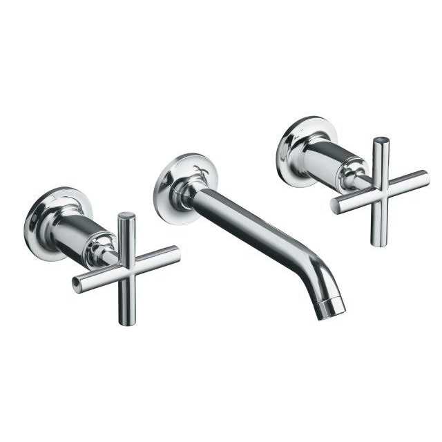 Capturing the style of minimalist design, Purist faucets deliver streamlined water control. This sink faucet trim features a 35-degree angled spout and cross handles for easy operation. The convenient wall-mount design provides a clutter-free countertop in your bath or powder room. When paired with a two-handle ceramic disc valve, this trim offers optimal performance. Combine it with bath accessories from the Purist collection for a distinctively modern and unified decor.