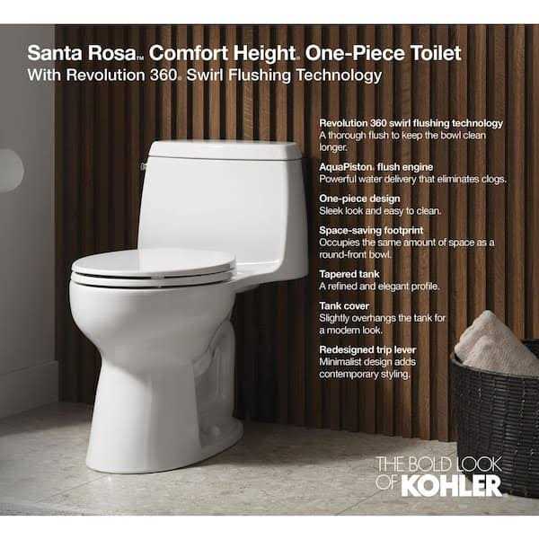 The one-piece design of this Santa Rosa toilet adds a contemporary look to your powder room. Perfect for smaller bathrooms and powder rooms where space is at a premium, the compact elongated shape takes up the same space as a round-bowl toilet, yet its elongated shape adds added comfort. Its 1.28-gallon high-efficiency flush provides water savings of up to 16,500 gallons per year versus an old 3.5-gallon toilet, without sacrificing performance. Revolution 360 swirl flushing technology keeps the bowl clean longer, and the chair-height compact elongated bowl makes it comfortable to use. A Quiet-Close seat is included.