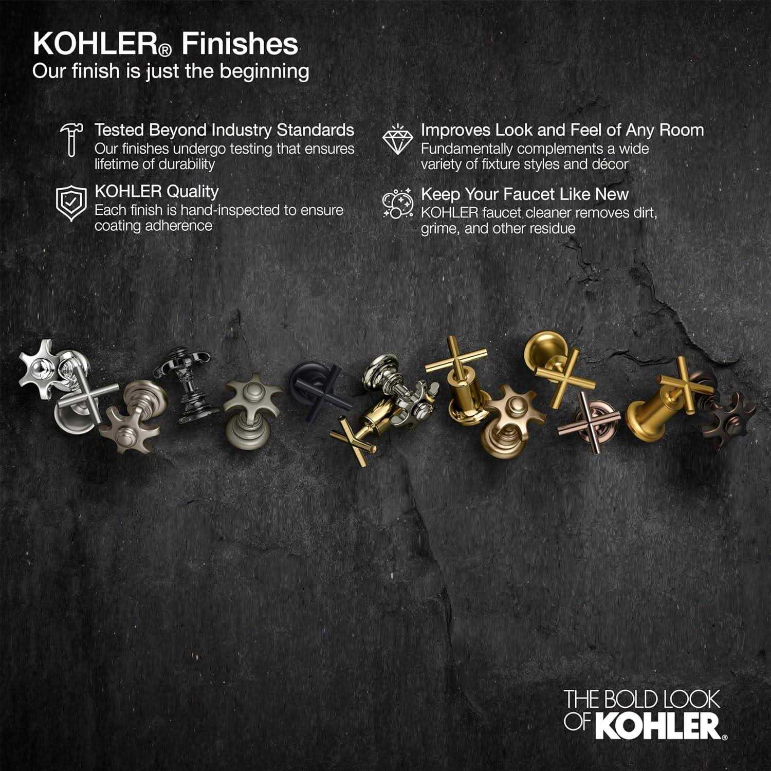 - Premium metal construction for durability and reliability.KOHLER finishes resist corrosion and tarnishing.Wall-mount